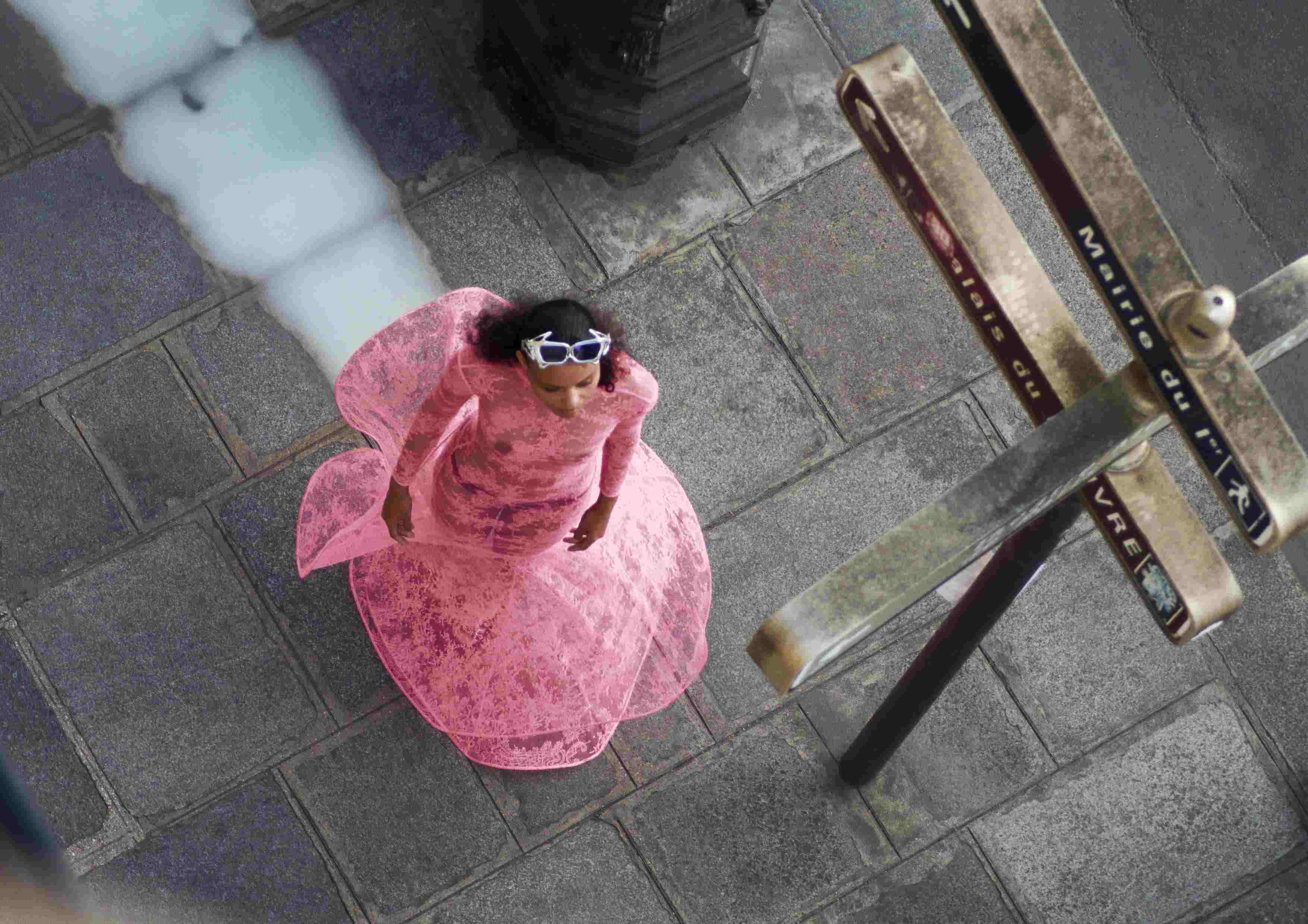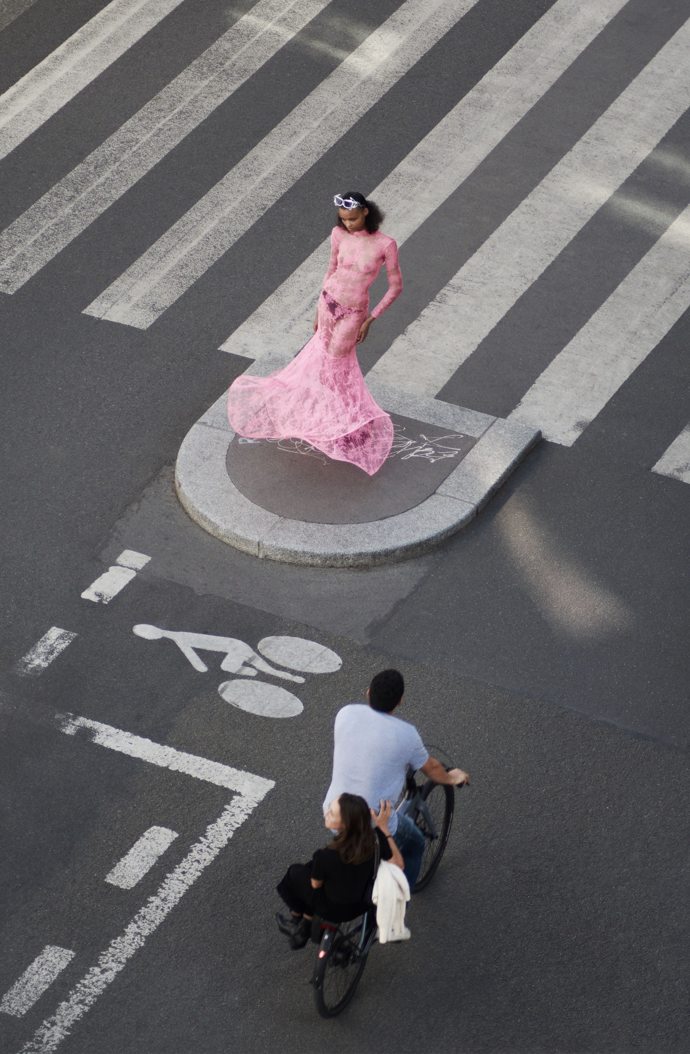 Jamba, the model, bestows her grace upon the Parisian streets while adorned in the visionary creations of Jisoo Baik. Her attire, featuring a pink dress with a distinctive circular shape at the hem, beautifully captures the harmonious blend of earthly and celestial aesthetics. In this ensemble, she showcases the remarkable influence of fashion in transcending conventional boundaries, seamlessly integrating personal identity with sartorial expression