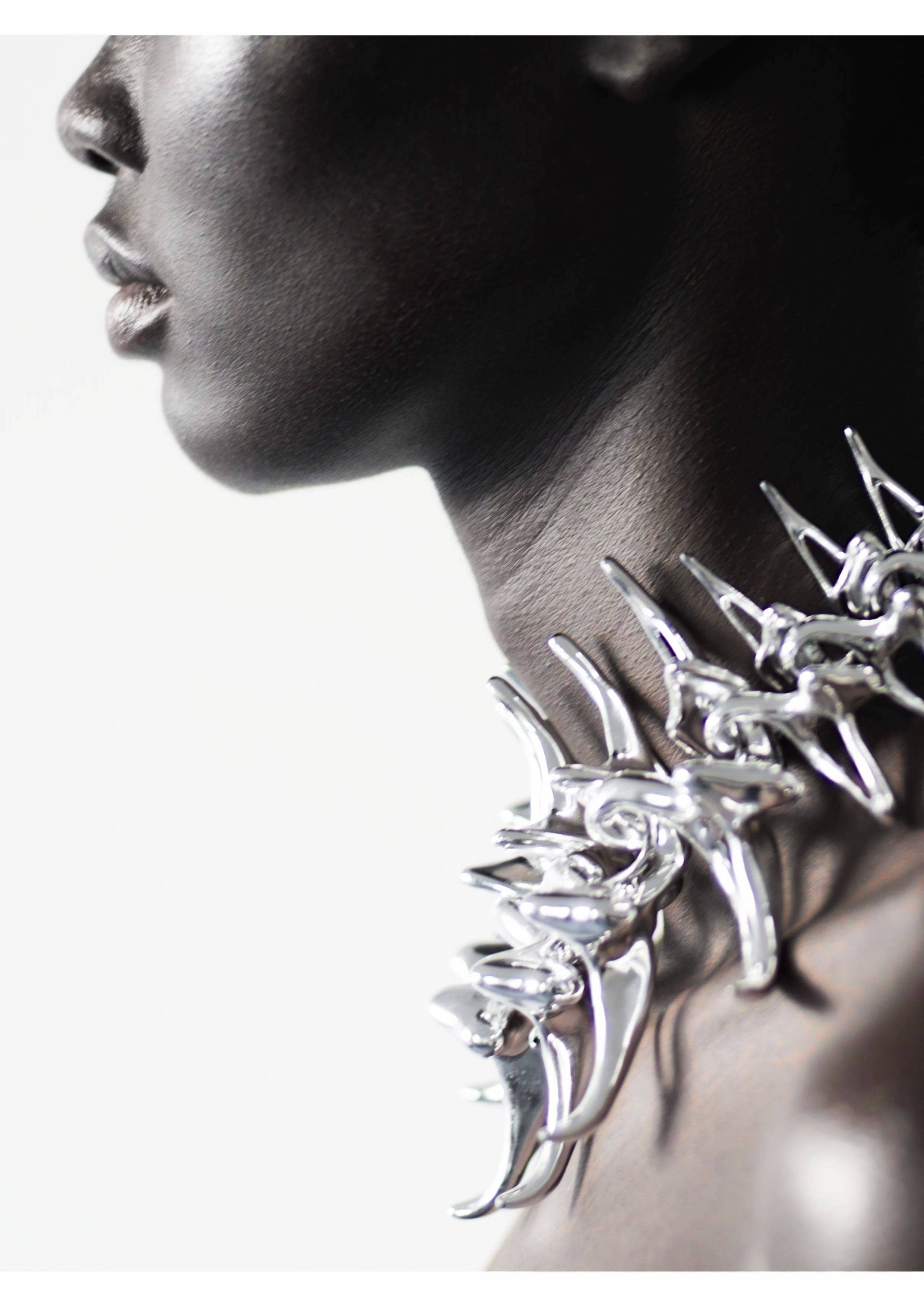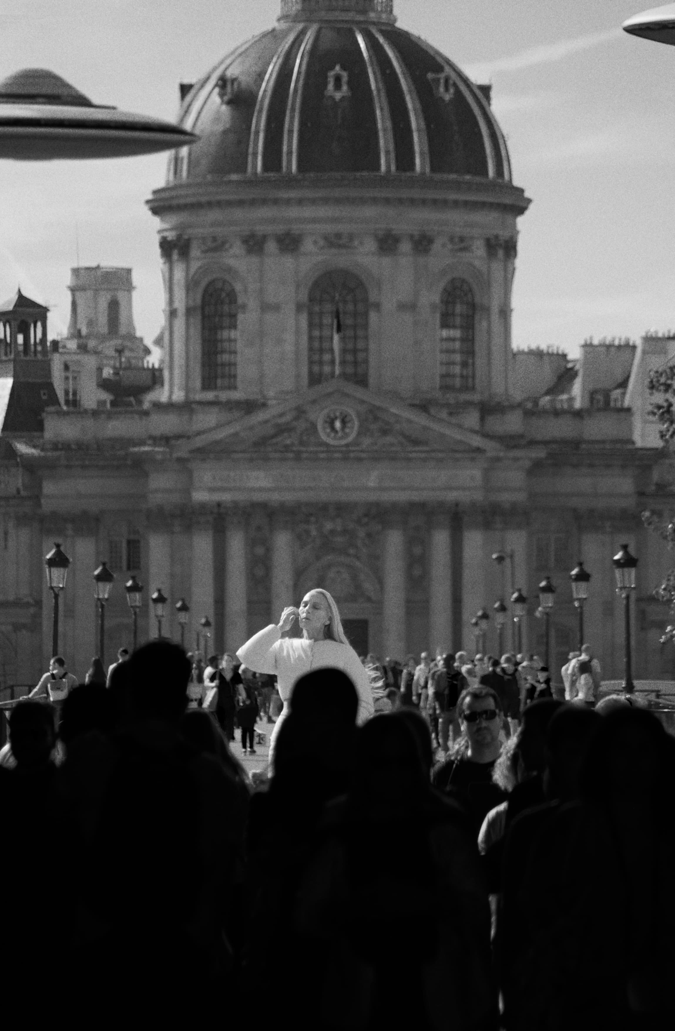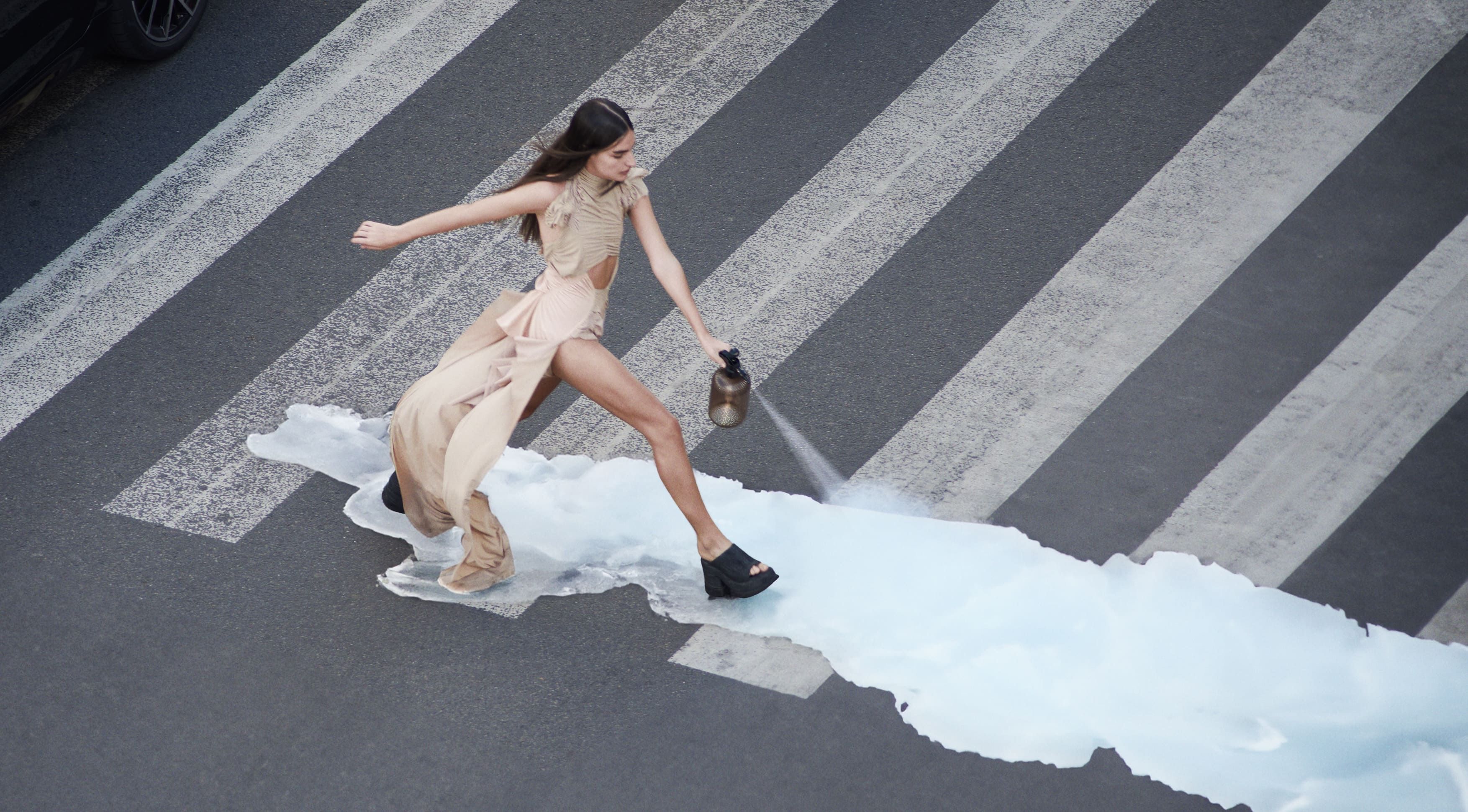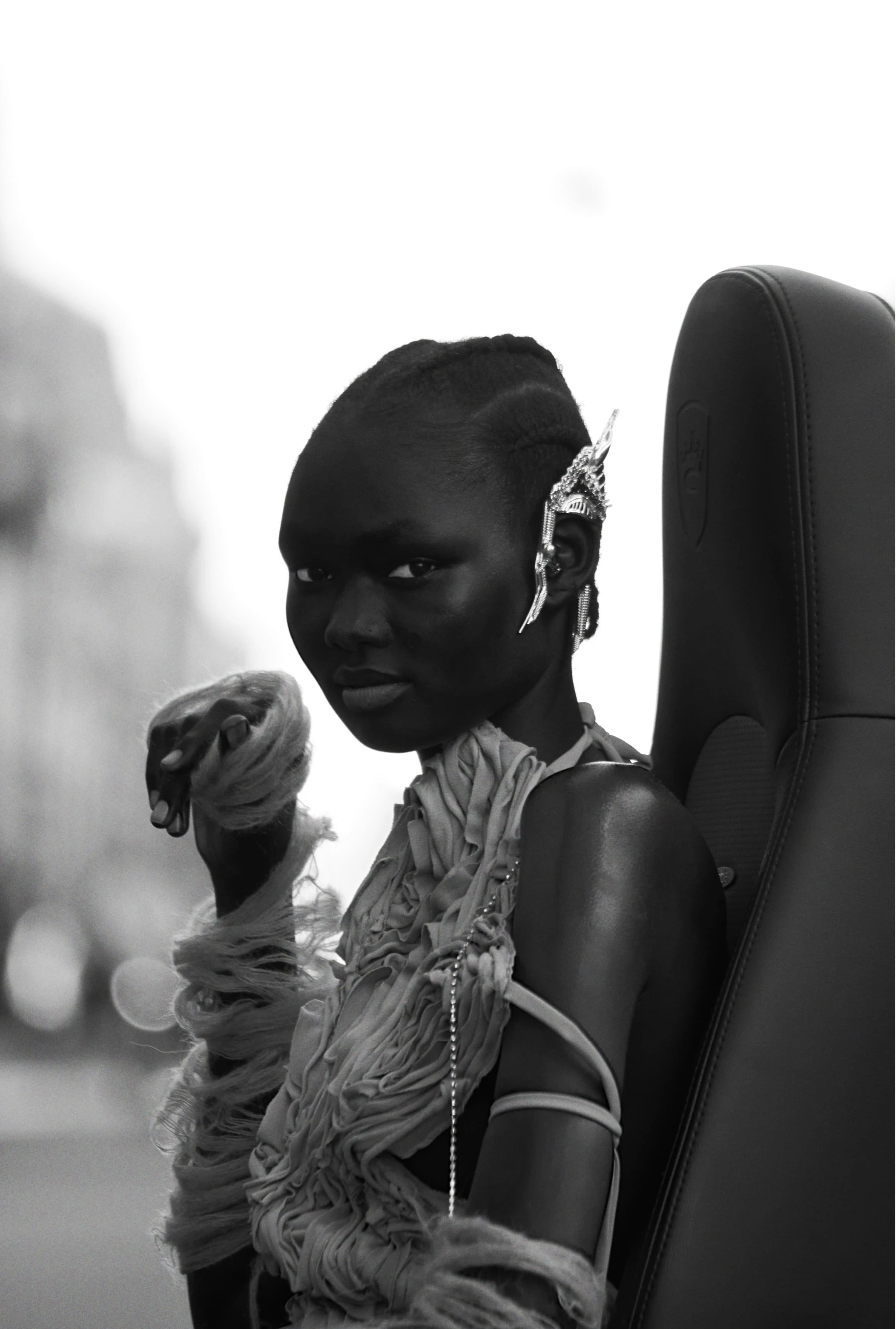 Model Ateta embodies a captivating intergalactic persona, exuding cosmic grace as she gracefully traverses the lively streets of Paris while seated on a floating armchair, leaving a trail of ice in her wake. Cloaked in a striking purple dress by Giorgia Andreazza and adorned with Sapiens jewellery, her presence beautifully exemplifies the harmonious blend of earthly elegance and celestial allure. Ateta's aura resonates with a deep sense of self-discovery, highlighting the inherent beauty of embracing one's unique form.
