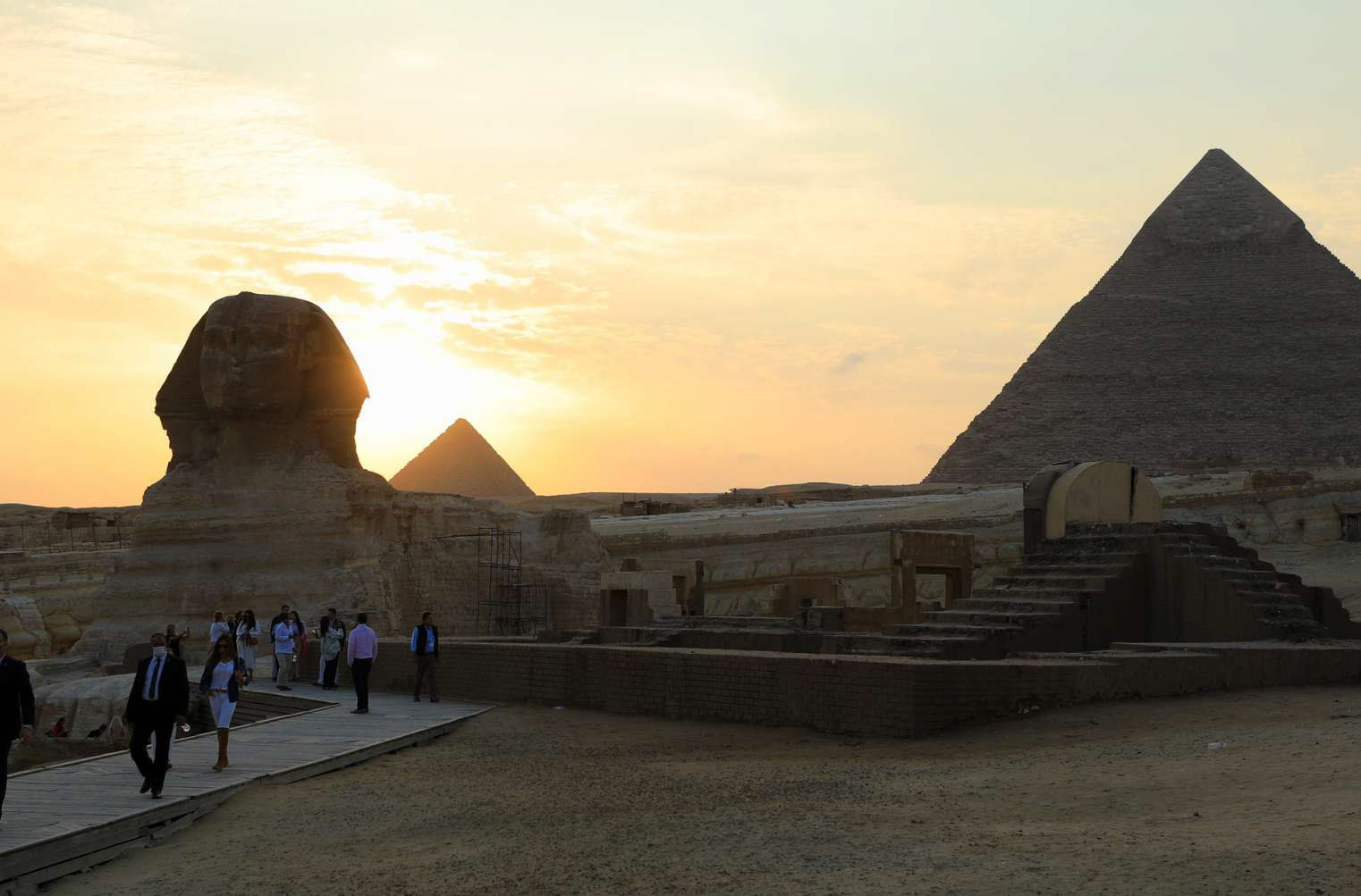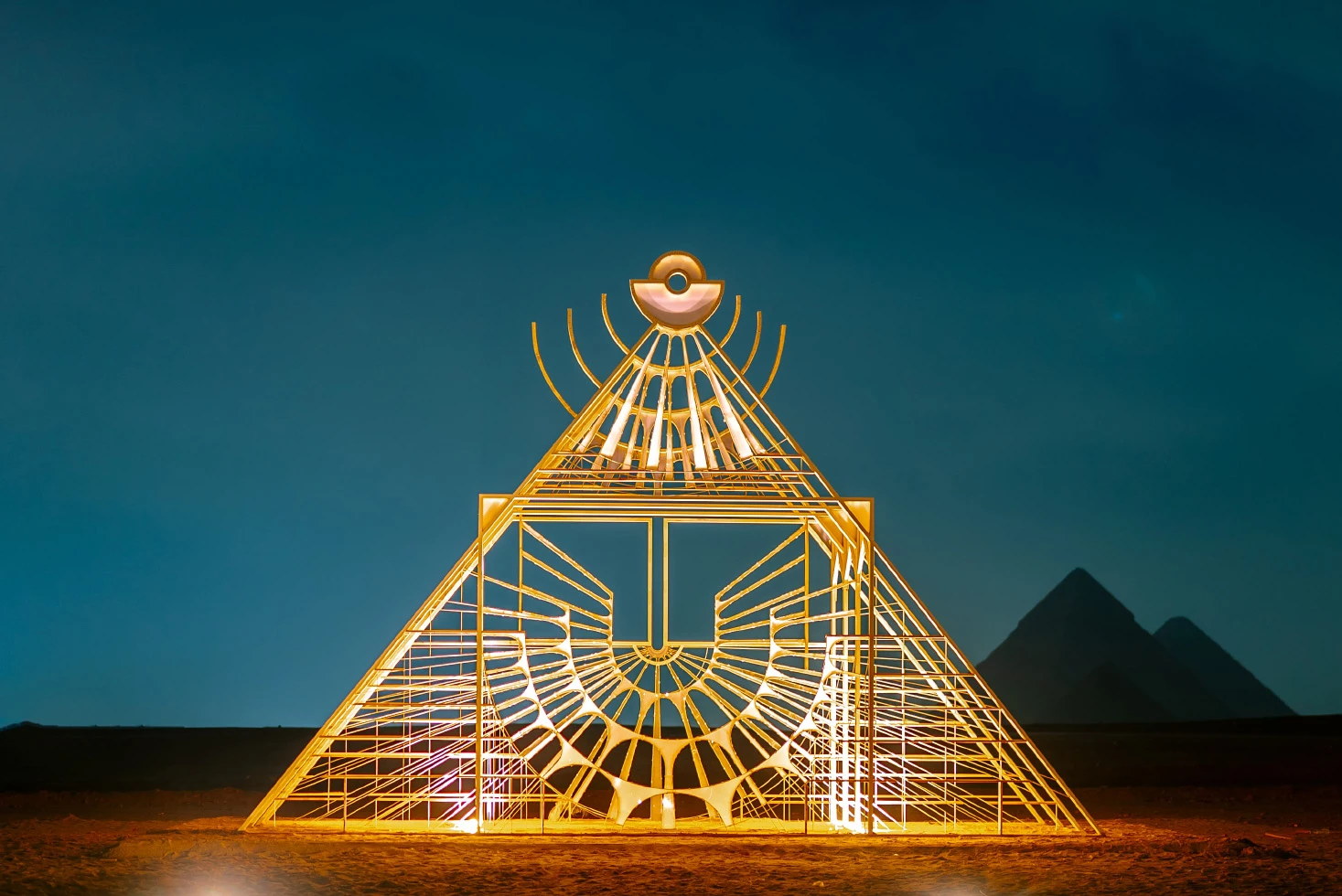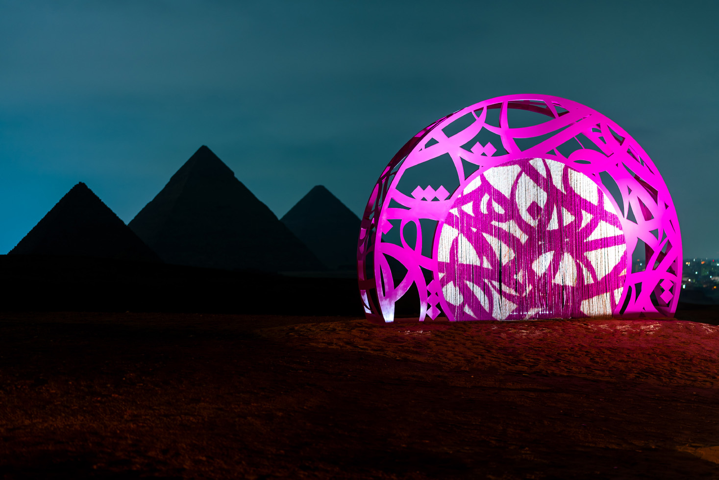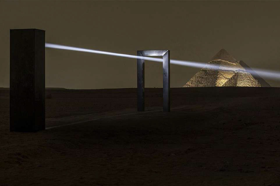 The site-specific installation Portal of Light by Emilio Ferro explores the imagery of ancient Egypt, contemplating the themes of threshold—as a bridge between the world of the living and the dead—and of light as it relates to the sun worship deities such as Isis and Ra. Inspired by two ancient papyri, the Book of the Dead and the Amduat (also known as the Book of the Hidden Chamber), Portal of Light follows the orientation of the cardinal points and the transformation of sunlight during the day. Two metal sculptures generate and expand a beam of light, following the perfect inclination of the three Pyramids of Giza. During the night, spectators can enter the installation under the beam of light and follow its direction, taking part in an immersive adventure to experience the journey into the night sky on the boat of the god Ra, as illustrated in the ancient papyri.