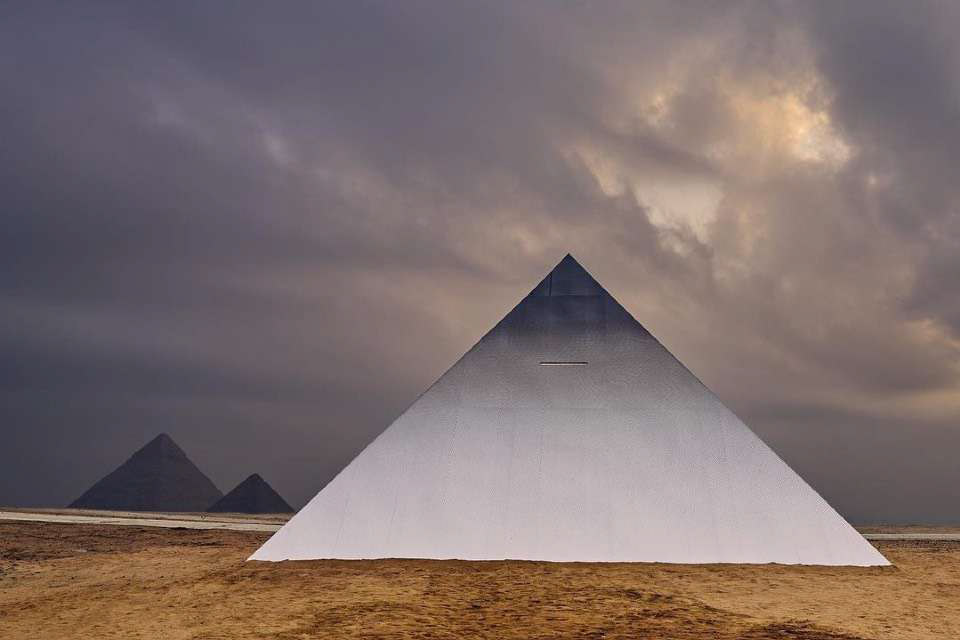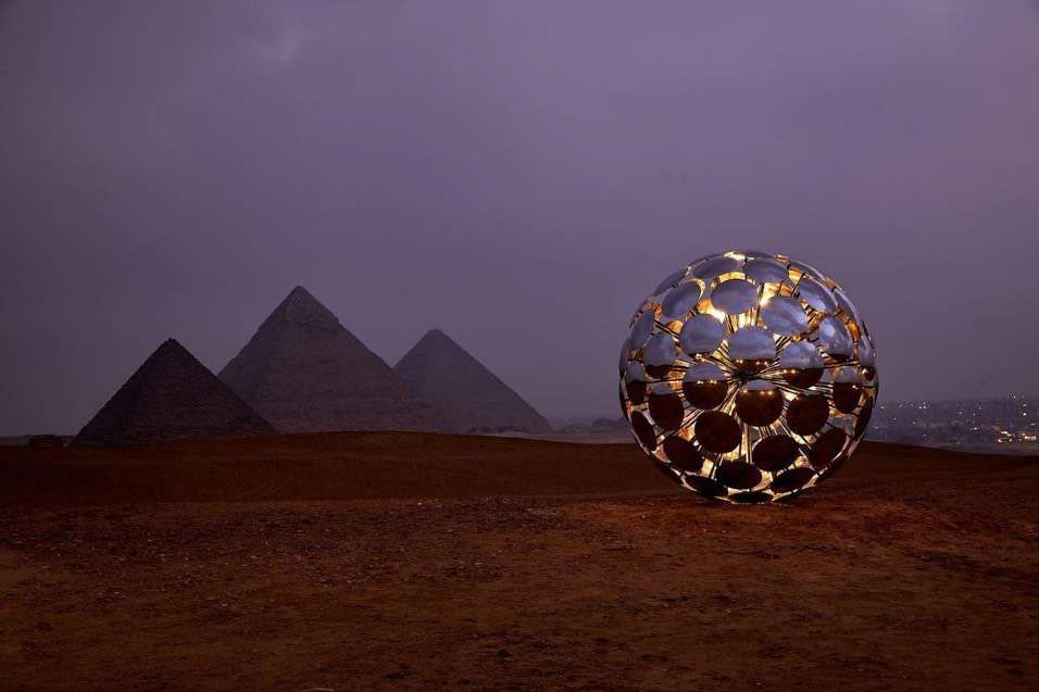 Orb draws its inspiration from the historical Egyptian heritage around it. The choice of form and materials in the piece is presented as a direct reference to elements of mathematics and symbolism present in classic Egyptian culture and in the pyramids in particular. The shape of the piece alludes to the ‘pi’ number concealed in the geometry of the pyramids and found when dividing the perimeter of a pyramid by twice its height. The sphere is an invisible part of the resulting geometry since a sphere with a radius as high as the pyramid would have a circumference very close in length to the pyramid’s perimeter. The surface of the artwork captures the pyramids, the sky, the surroundings, and the viewers in a multiple fragmented reflection. It references the role of the circular mirror in historical Egyptian symbolism, where it was linked to the sun and conveyed notions of creation and rebirth.