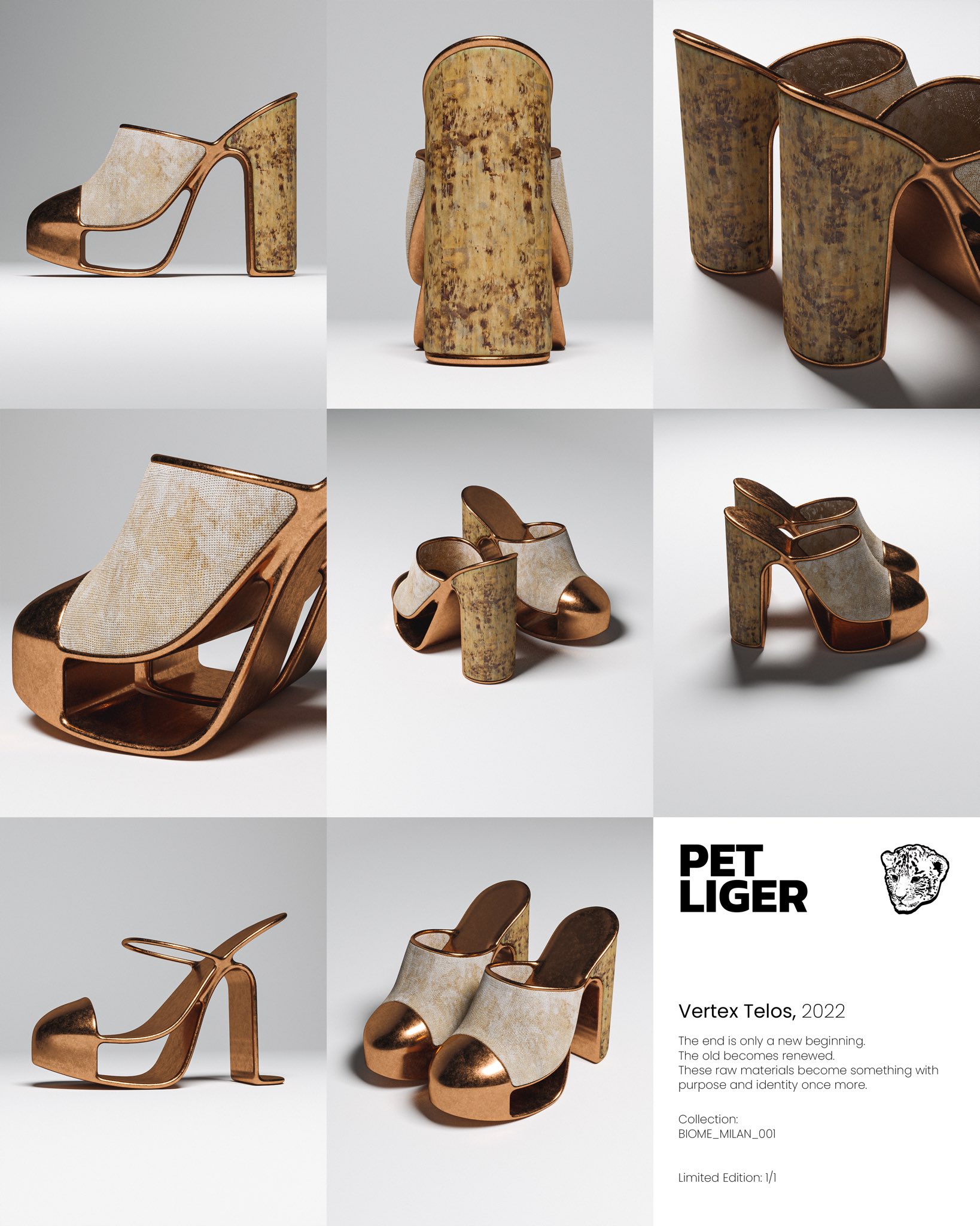 I have to mention that the recent collection we put together for Milan Fashion Week is pretty epic! 20 unique PET LIGER heel silhouettes that are part of the BIOME_COLLECTION are up for auction on SuperRare! Including this incredible encapsulated living breathing animation named ANEMOS. A collaborative effort of staggering proportions. Featuring the immensely talented computational architect Pico Velasquez, VIIRA. Cutting-edge sound design from highly regarded producer and performer AKITO. 3D wizardry from SKETCHY VISUALS and of course footwear concepts from myself.