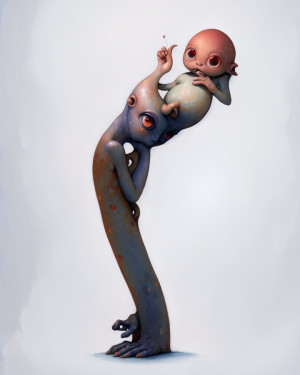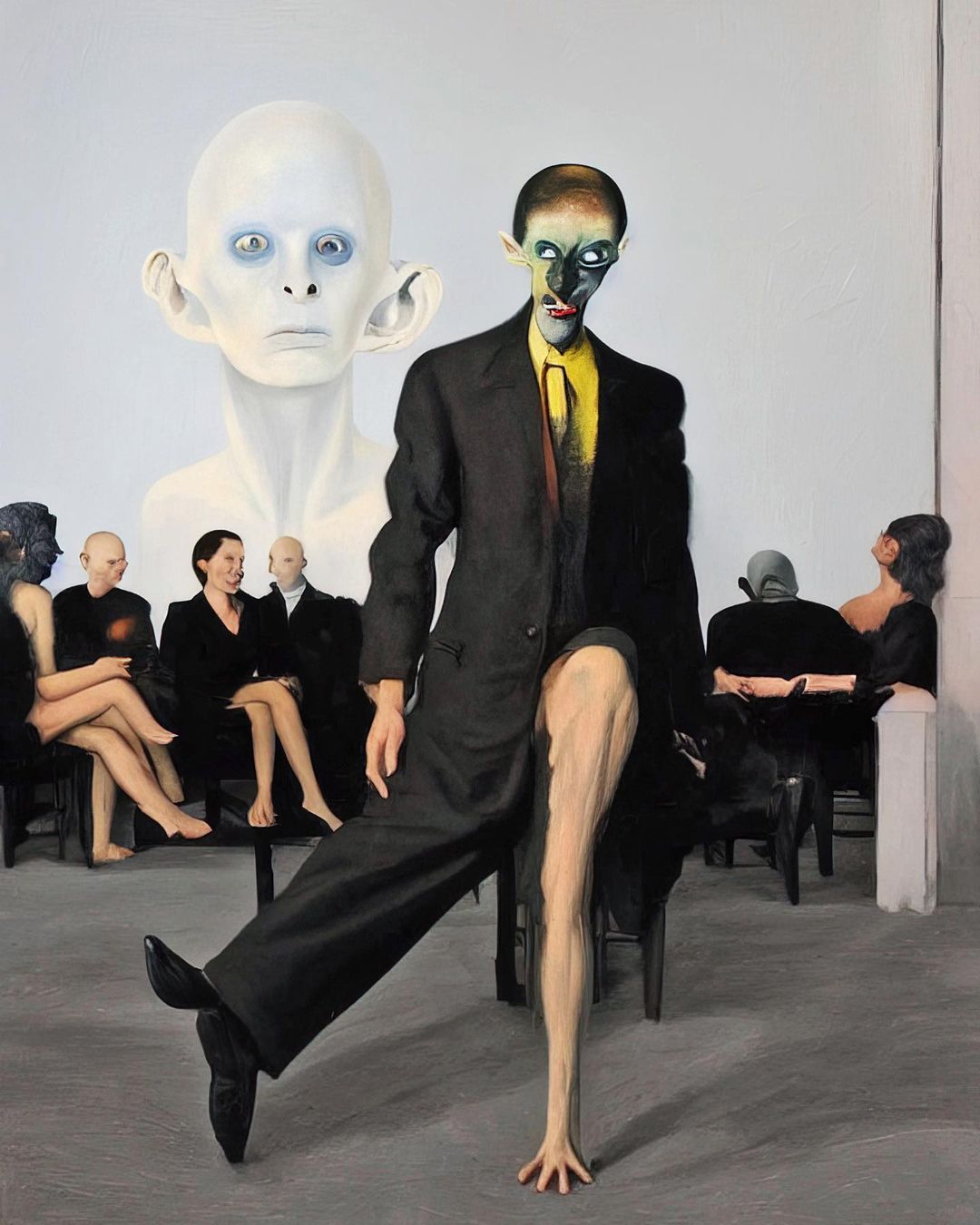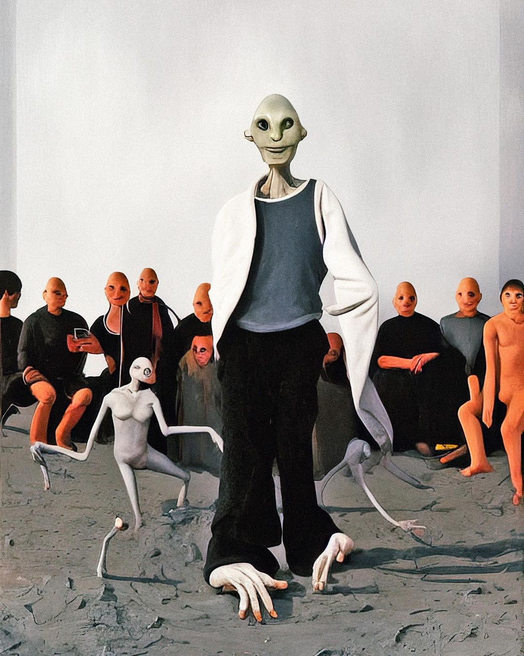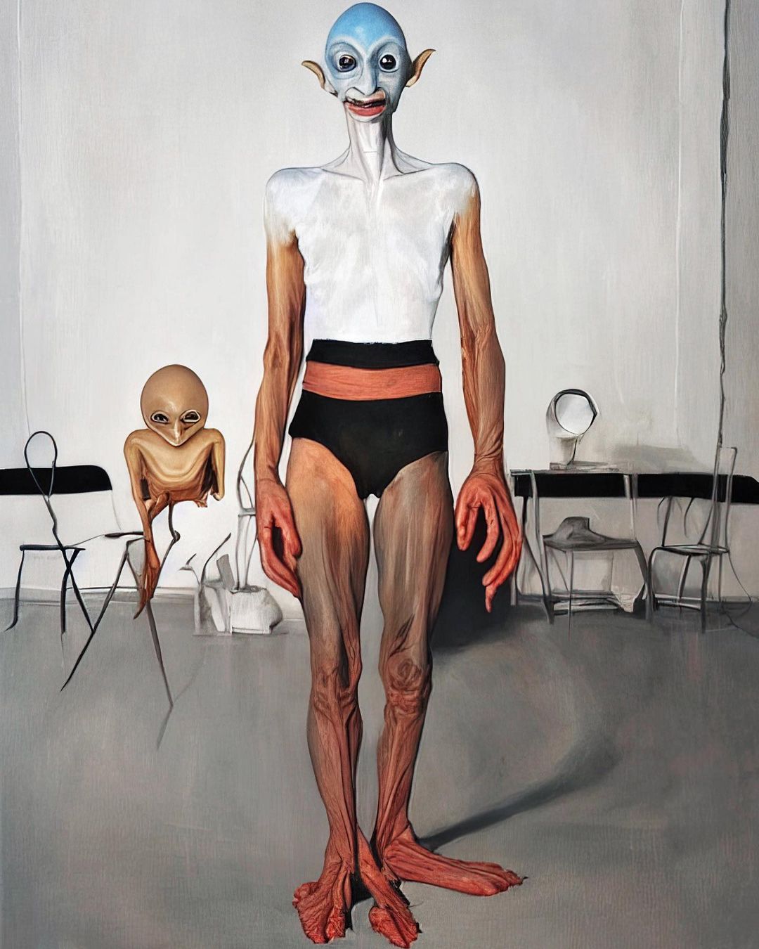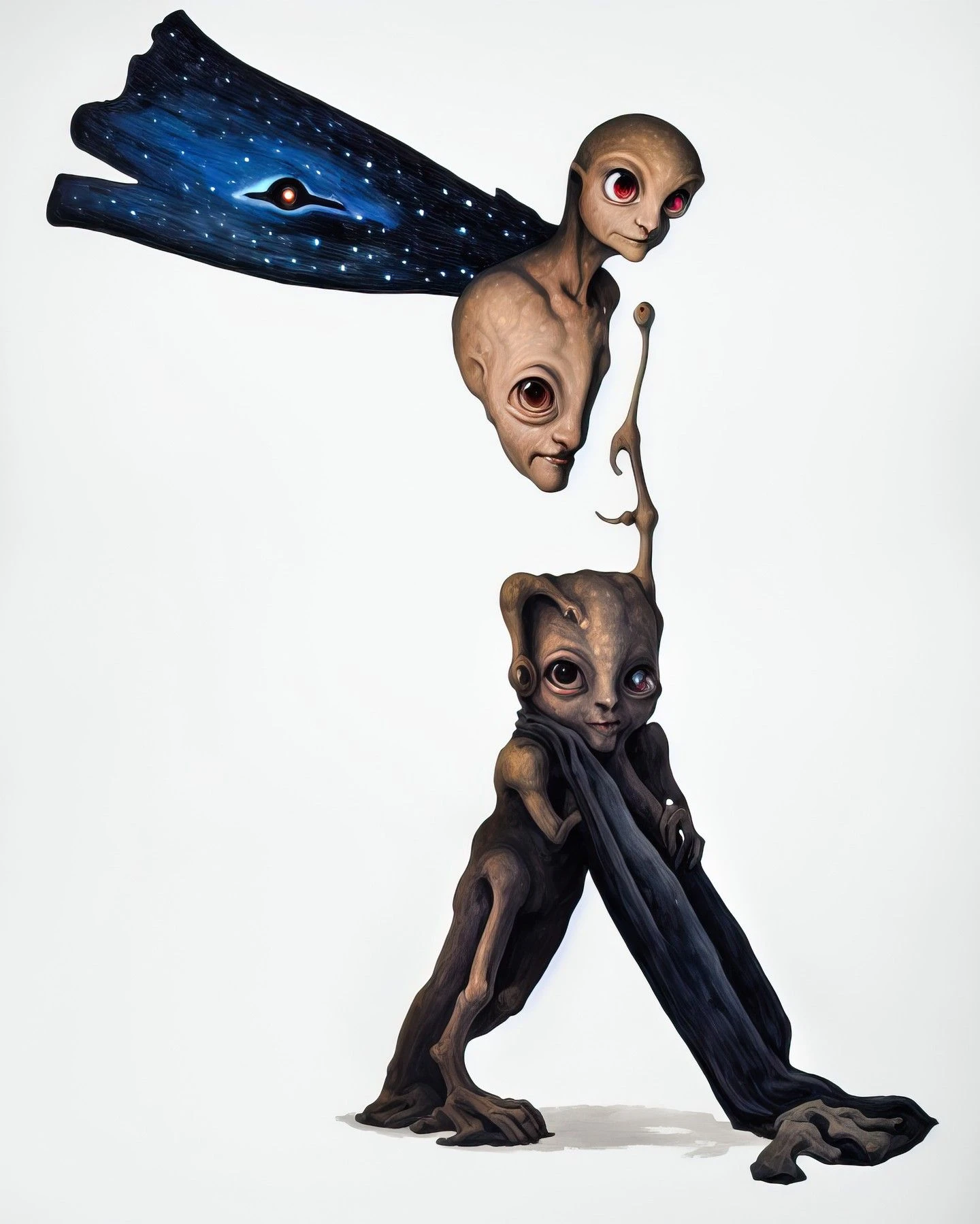 But Willie is someone who embraces the bizarre and the interesting and the complex, and she's just like, yeah, let's do it! The way that me and Willie co-created was a lot of just back and forth around talking about our interests. Willie is a big Sci-Fi fan and had a few different authors that were just dealing with subjects she really liked, and I asked about the books she had been describing and about the creatures in the books. Because in the books, there's a whole race of alien creatures, I found out descriptions of those aliens and for me, that was really an exciting point because I was already exploring the ability of AI to deal with this concept of expansive identity in my own artwork. I deal a lot with this concept of expansive identity. Using AI was a way for me to explore my representation as a human, my representation as a gendered person or not so gendered person. So aliens kind of became the stand in for me that was, like, existing outside of the kind of binary that we exist here on Earth.