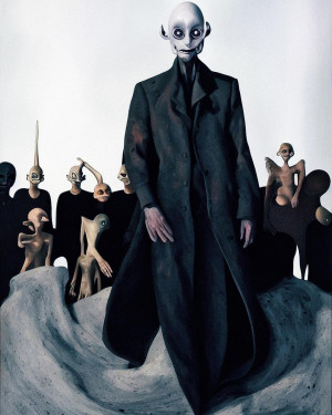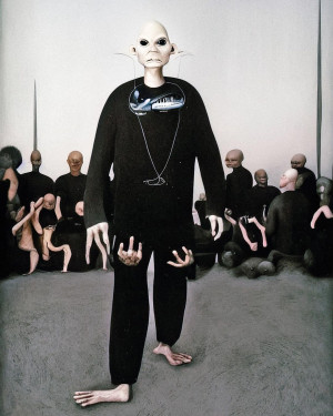 In other words, using two aliens from my renderings as a starting point, Willie designed a cast of creature groups for IDEAS 5 using handmade masks, makeup and foam latex prosthetic elements masterfully applied by three different SFX artists, to build them.