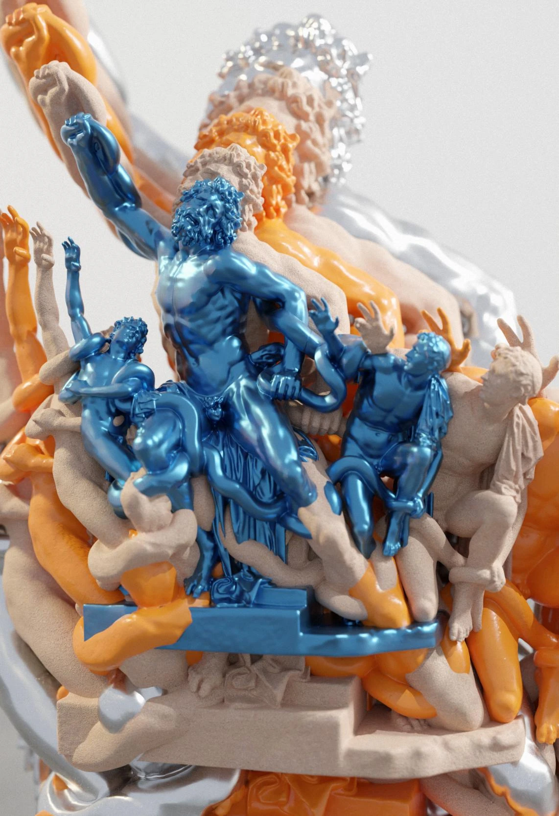 Farnese Bull Reverse (2023) embodies the meeting point between technology and art. Starting from a 3D scan of the Farnese Bull sculpture sourced from an online marketplace, I digitally duplicated, rotated, and finally materialized the piece in sandstone. This layered transformation - from ancient icon to commercial dataset, to digital reconfiguration, and then physical manifestation - echoes Rosalind Krauss’s “post-medium condition,” in which works resist fixed classification within a single medium. The piece questions originality as a genealogical myth, replacing it with an “archaeology of the copy” that positions the viewer in a space between historical reference and simulacrum.