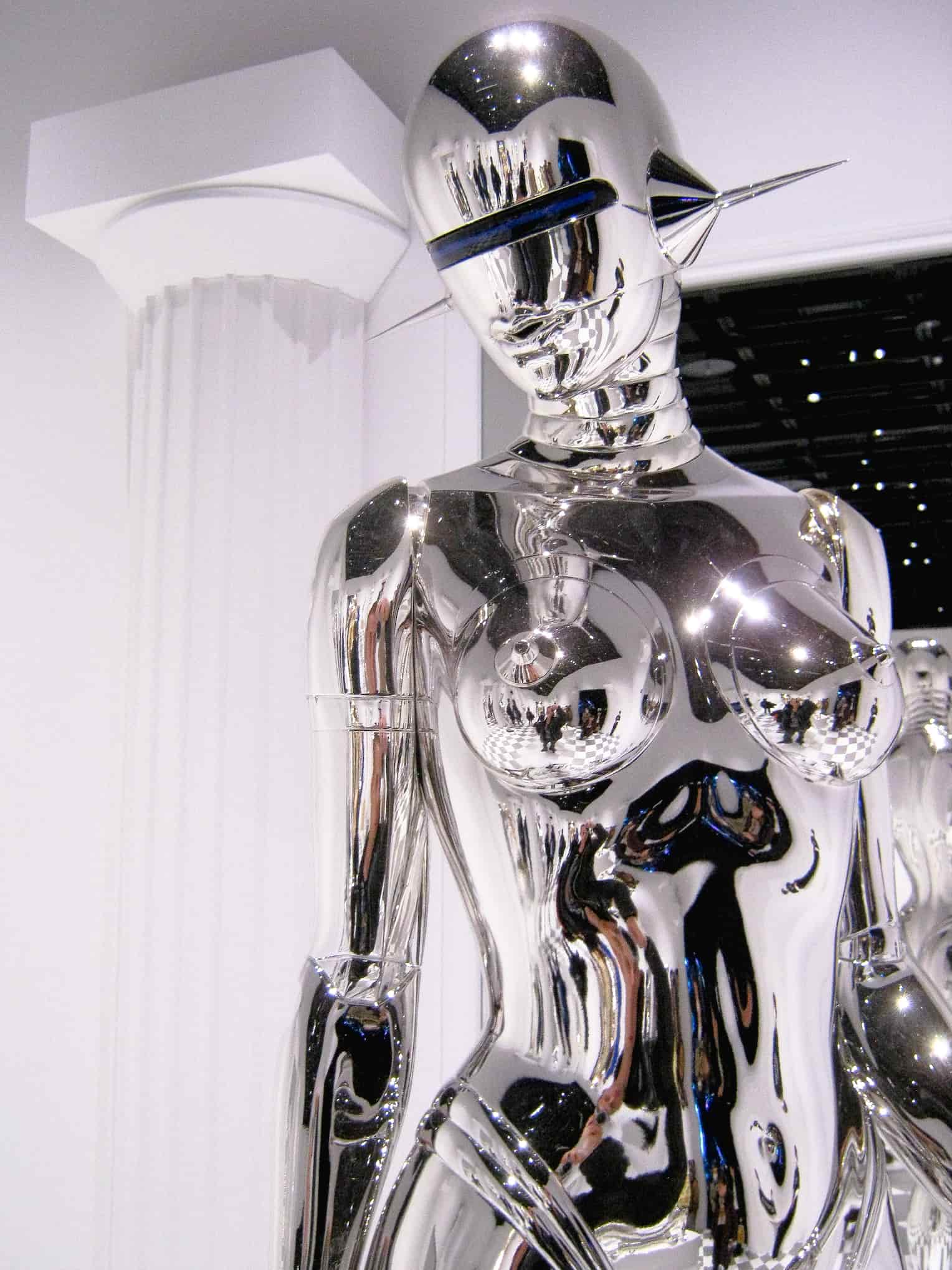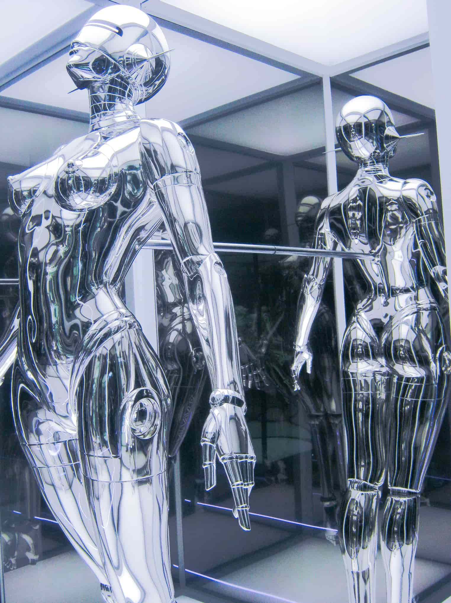 His figures are sensual, almost provocative. The curves of their metallic bodies recall classical sculpture, yet they belong entirely to an artificial universe. These are designed bodies, polished to perfection.
