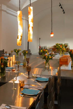 Rich Aybar, meanwhile, reached back into Converse's origin story. The brand was founded over a century ago as a rubber company, and that heritage anchored his contribution. Known for sculptural works that elevate industrial substances into contemporary artifacts, Aybar brought his material obsession to Milan with MENSA, a dining instrument in translucent rubber that reimagines the Roman mensa ponderaria, an ancient measuring table, as modern infrastructure. Carved with six calibrated cavities, MENSA structured the table, organizing portion, pause, and exchange with quiet authority. Installed along the center line, the piece became a visual axis for gathering. Under the lights, its rubber body held and released glow, turning the meal into both image and a sort of ritual. In Aybar's hands, craft was texture, stitch, weave, precision and repetition, a philosophy that echoes First String's millimeter-level attention to form, fit, and all the finish.