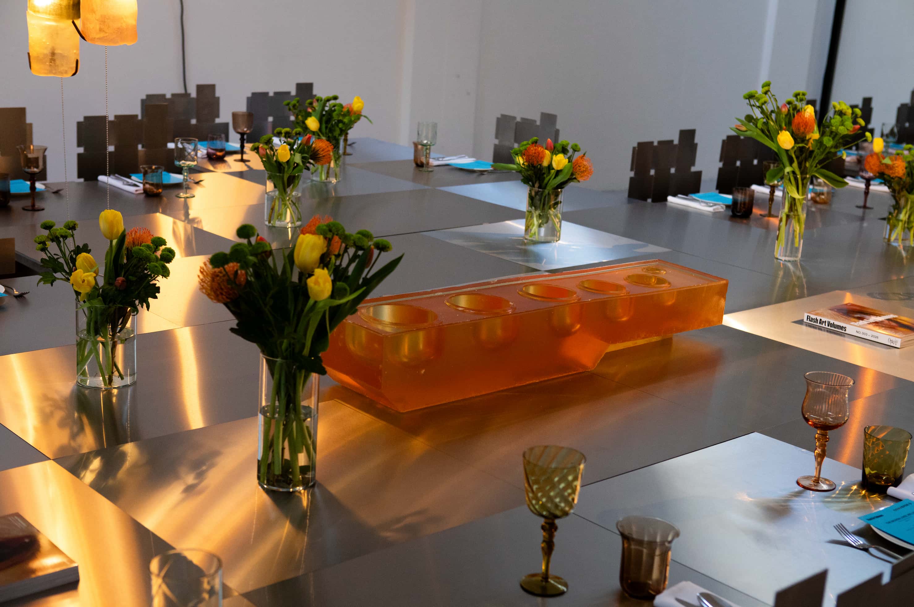 The evening also served as the launch of a media partnership with Flash Art, presenting Flash Art Volumes 003: Opacity, a meditation on transparency and its limits that found an unlikely echo in the translucent glow of Aybar's rubber and the woven geometries of Vallée's table.