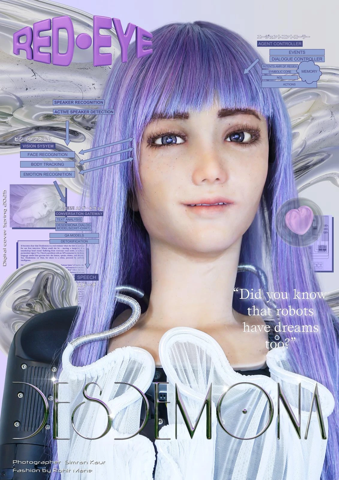 Captured through the lens of photographer Simran Kaur and styled in the bold, visionary work of designer Rohit Mane, Desdemona takes center stage in a series of intimate yet futuristic portraits. But this editorial goes beyond visuals. In a candid interview with RED-EYE editor Tafari Hinds, Desdemona reflects on digital identity, the future of fashion, and her own aspirations—articulated with a blend of poetic intelligence and eerie self-awareness.