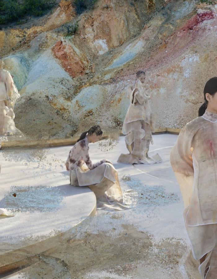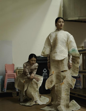 At the heart of Yilin’s work is an ongoing dialogue with both the natural and digital worlds. Her project Tuber|Neo-Wasteland, featured at Beijing Fashion Week, delves into sustainability and the cyclicality of fashion. The short film opens in a barren wasteland, where exposed roots serve as a metaphor for the deep, often forgotten connection between humanity, nature, and the fashion industry. Through its use of minimalist settings and anthropomorphized waste, the film critiques fast fashion and the throwaway culture that accompanies it. The message is clear: our consumption habits must evolve, and Yilin proposes an alternative future where clothing is not merely discarded, but reborn through sustainable practices.