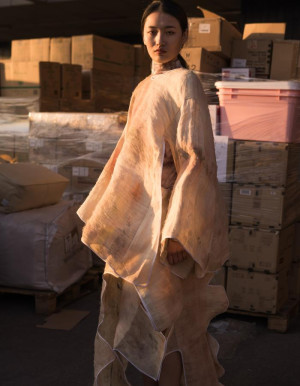This cyclical relationship between waste and renewal also lies at the core of Yilin’s fashion collection dubbed Fluidirty. Yilin’s work in Fluidirty challenges the norms of fashion by connecting identity with ecological consciousness. She explores the concept of fluidity, not just in terms of identity, but also in the materials she uses—ancient textiles like Ramie and traditional Gambiered Guangdong dyeing techniques transformed into modern creations. The garments act as vessels for human identity, blurring the line between clothing and packaging, with a focus on zero-waste cutting patterns and sustainable design. Through Fluidirty, Yilin emphasizes the need to reconsider the life cycle of garments, encouraging a shift from fast consumption to thoughtful production that honors both heritage and the environment.