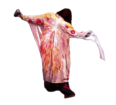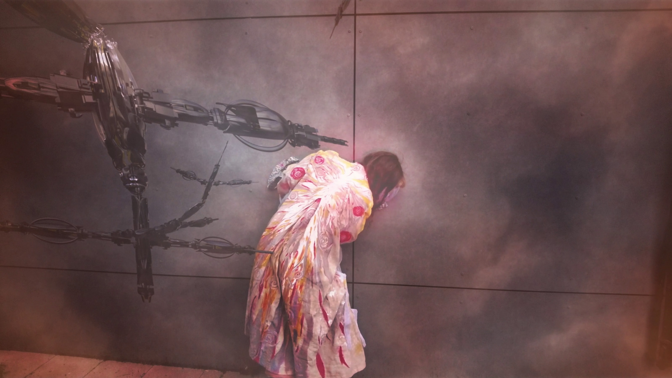 The only negotiating stuff I remember was technical discussions. “00045 forgive” was actually the idea of AUJIK, and he asked me if I am open to filming it. I was so excited and wanted to give it the honor it deserves. Therefore I painted a coat and outfit for it in my own painting style and asked Rocio Gauna to film me and help with the light. After that we got into the long process of editing. AUJIK added his magic with his cybernetic trees moving along and dancing with me and I tried to bring the material together in the cutting and final editing of the video.