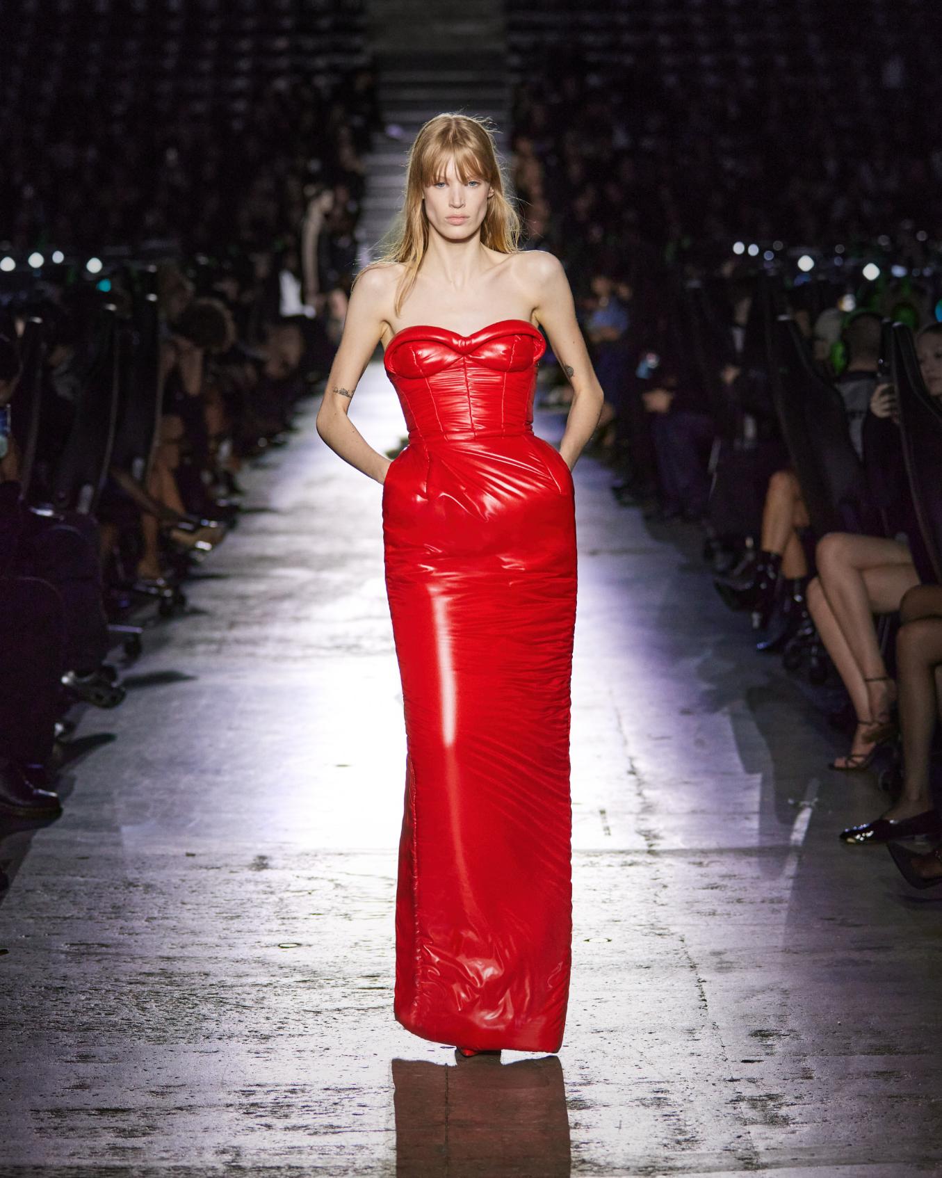 Coperni’s show is one you can never afford to miss, and this season was no exception. The set was key to the narrative: LAN Party was the concept, a nod to the social gatherings of the ’90s where gamers connected to play in a shared virtual world. This time, however, the connection happened in reality—guests were seated at long desks filled with computers and screens, creating a dreamlike tech utopia for digital natives. Between the aisles of this high-tech setup, the models walked the runway. The collection embodied the spirit of a new, multilayered woman