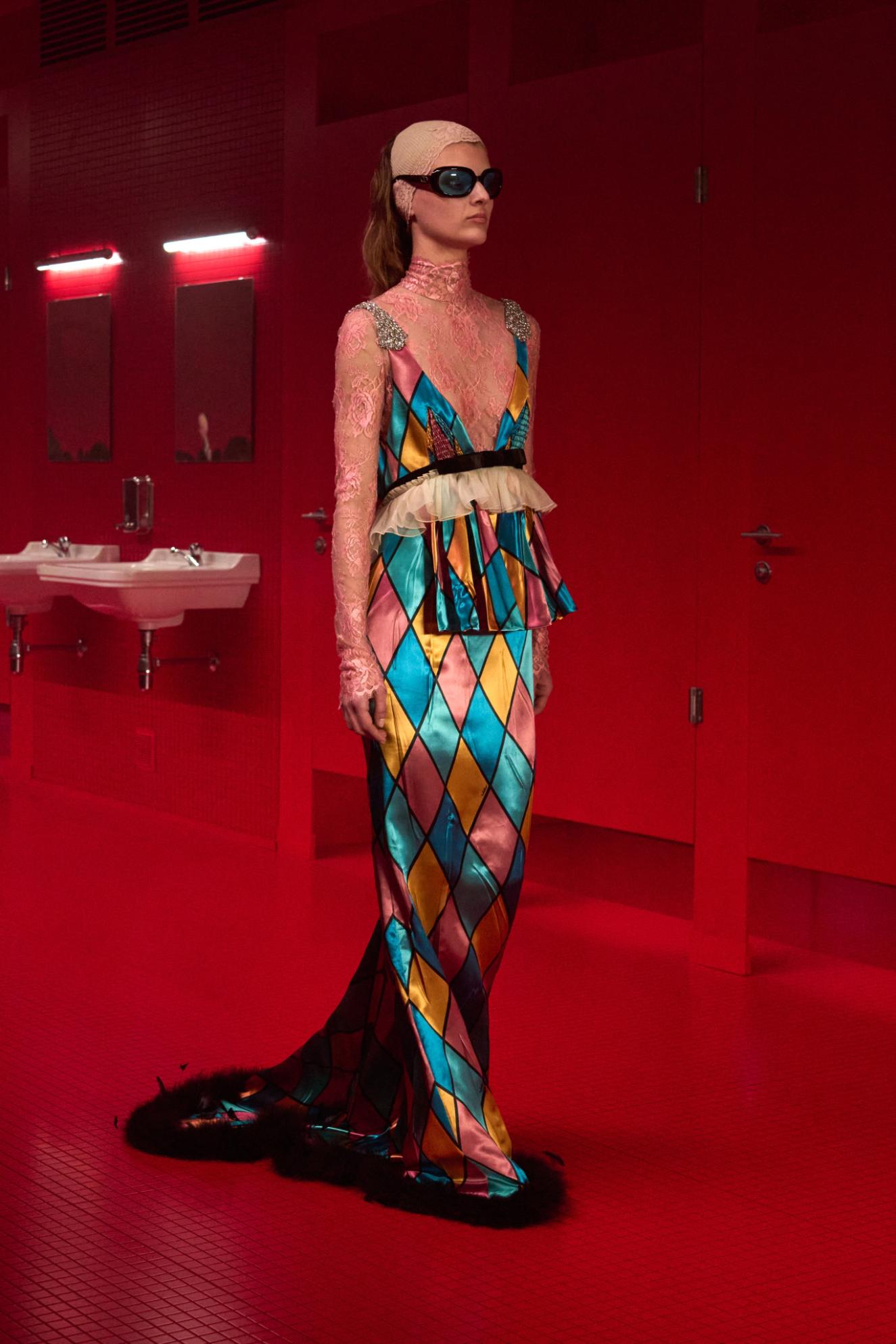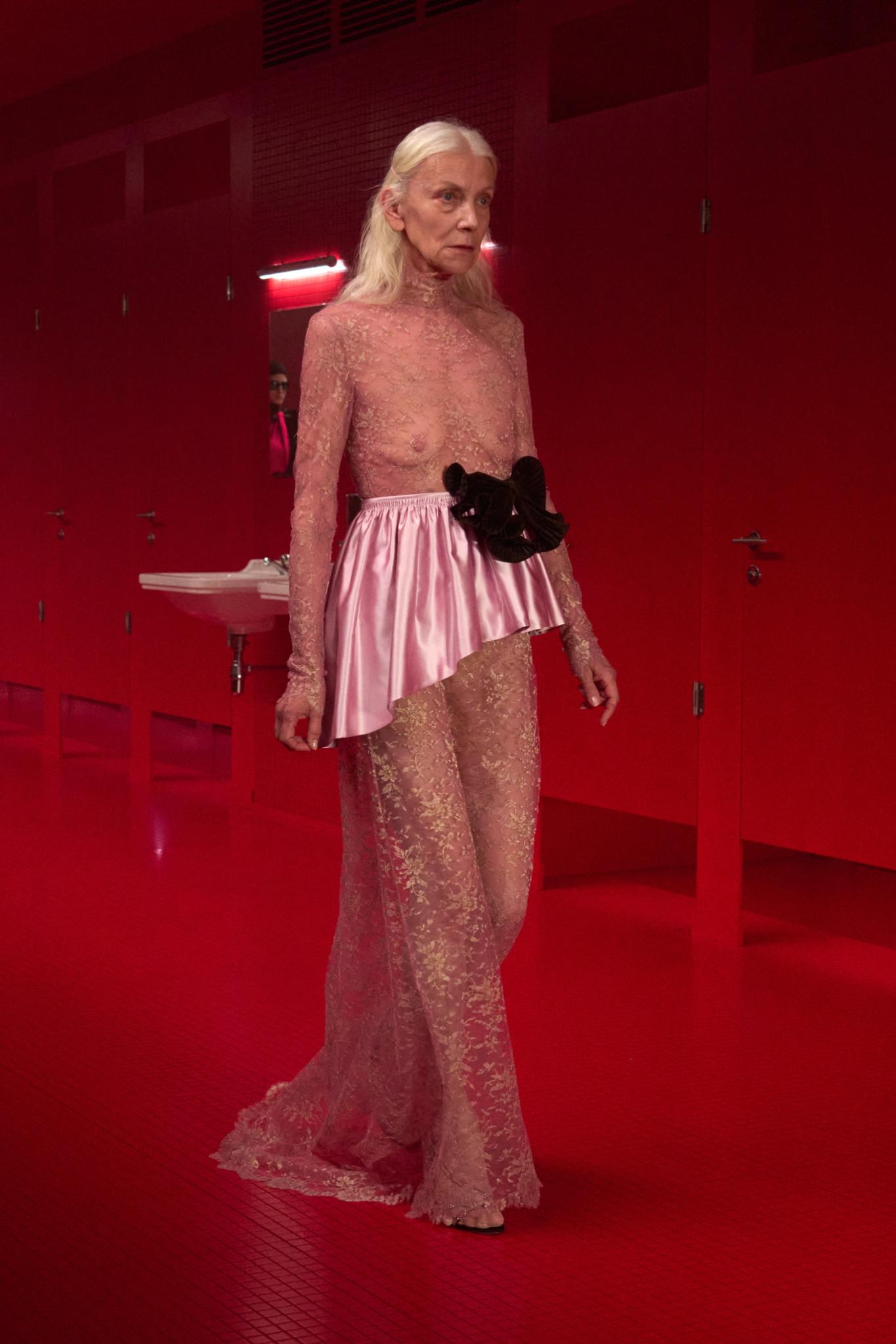 “Intimacy as performance, identity as a stratification of surfaces.” This is how Alessandro Michele describes his latest Valentino collection, Le Meta-Théâtre Des Intimités. The set, designed to evoke a public restroom, was defined by bold, red walls and floors, conjuring up the shared, exposed spaces of gyms, schools, and clubs—places where people come together, sometimes unknowingly, to reveal their vulnerabilities while searching for their own identity. The bathroom itself became a meta-théâtre, a stage for the intimate performance of self-exploration.
