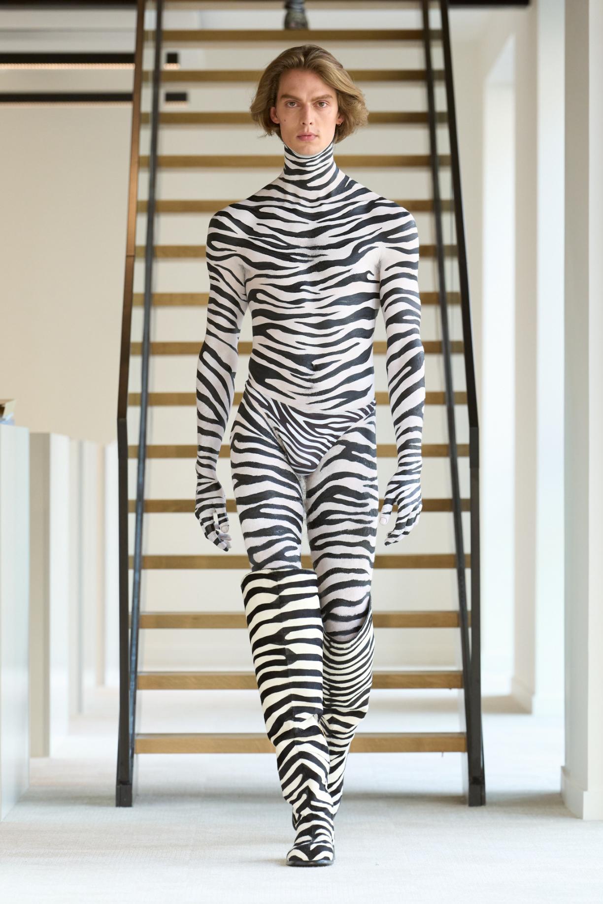 Duran Lantink’s latest show was impossible to miss, leaving a massive impact on social media and throughout the entire Fashion Week. The designer presented something truly unique, showcasing a strong, distinct identity. Lantink boldly mixed animal prints, tartans, camo, geometric voluminous shapes, and checked patterns—each contrasting element seamlessly blended together, creating a coherent and innovative collection. Standout moments included Leon Dame in full-body zebra print, paired with a thong and zebra boots. A female model wore a latex masculine chest top, while a male model sported a similar top with exaggerated, bouncing breasts. Several pieces featured distorted shoulders that rose up to the jawline while some skirts created a floating effect, further pushing the boundaries of shape and structure. Lantink’s collection was an unforgettable statement of creativity and boldness, capturing the essence of experimentation.