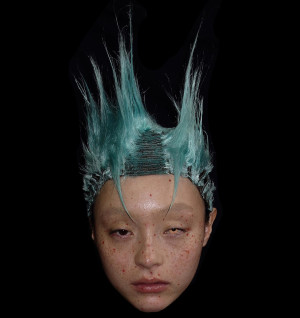 Of all the hairstylists showcased today, Yuho Kamo is the most singular one. Often involved in digital-focused projects, Yuho’s hairstyling is a way to deviate, distort and disrupt beauty standards that still dominate across all platforms. In what, in this sense, can be called an anti-hegemonic creative enterprise, punk and grotesque are great influences both as a general attitude and in the looks created. Taking inspiration from horror and thriller movies, Yuho Kamo is not afraid to deal with “bad taste” by mixing it with counter-cultural references: in his debut zine HAIRMASTER, distorted portraits and disturbing CGI enhance the anti-beauty stance of the author who is committed to only using synthetic hair as an antidote to the constraining standards of the contemporary fashion landscape.