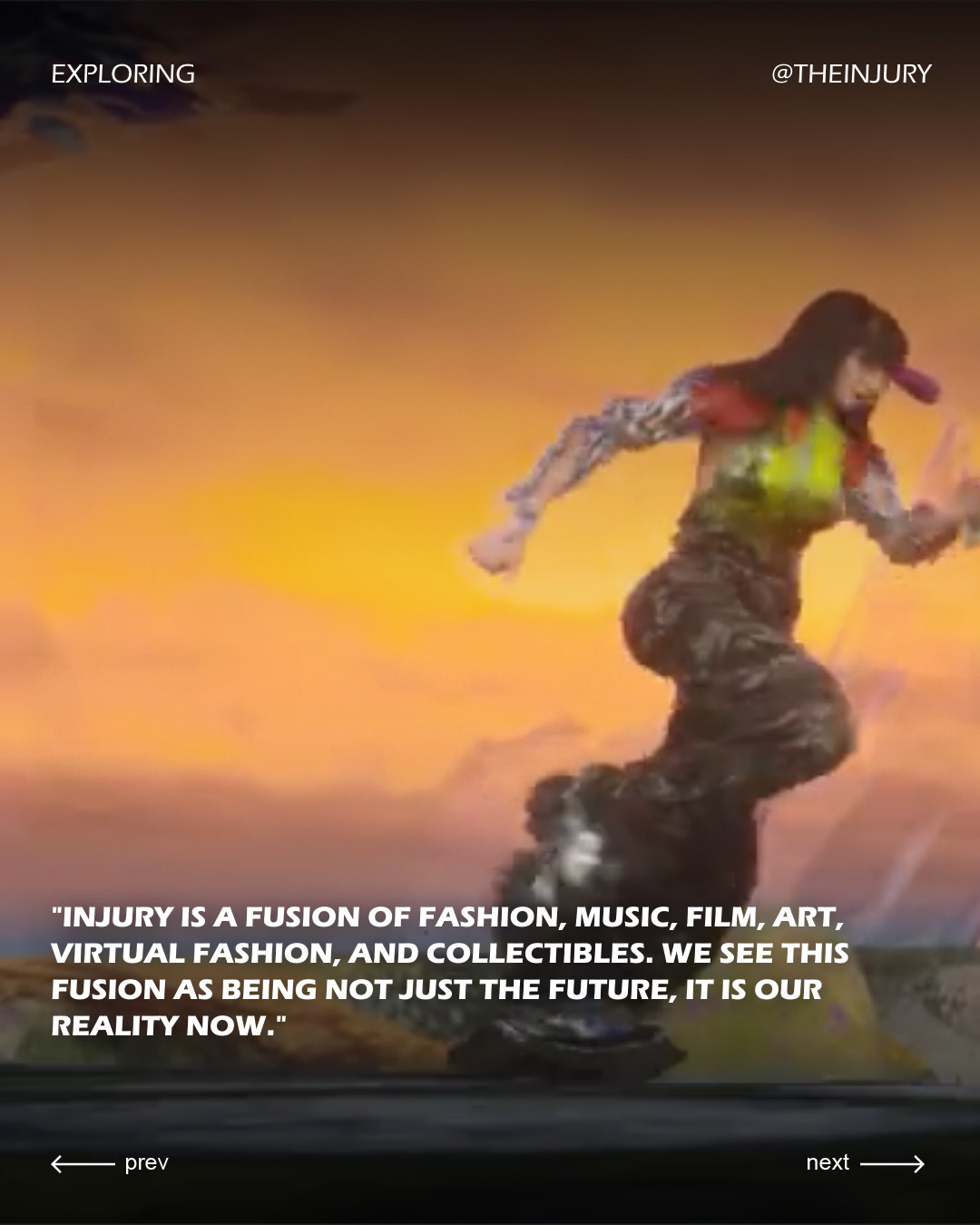 "INJURY is a fusion of fashion, music, film, art, virtual fashion, and collectibles. We see this fusion as being not just the future, it is our reality now."
