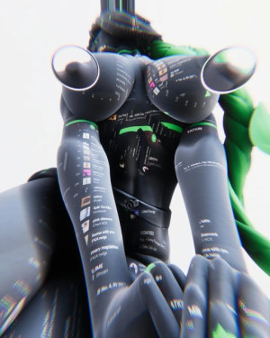 In the series of works featuring interfaces from Pornhub, I superficially explore the relationship between ourselves, our sexuality, and the digital realm. And when I say SUPERFICIAL, I mean it quite literally because our way of relating is superficial, sterile, and consumed quickly. That's why these interfaces scroll over the surface of bodies, as if reflecting upon them. I have a special fondness for these works because, for me, they directly touch upon our desires, secrets, and hidden pleasures. They appeal to our intimate and private selves. I like to think of them as a digital aphrodisiac. They engage the viewer, as anyone can feel identified with them. They point at you and say, "If you recognize this interface, it's because you've seen yourself consuming its content, and you probably enjoy it." Many people are impacted by them; they are drawn to them, feeling that magnetism and touching upon memories of pleasurable moments. Ironically, they make others uncomfortable, ashamed even. They touch upon very human emotions. When I started this series, it was serendipitous, during the COVID pandemic. I began experimenting by overlaying textures from streaming companies onto these 3D models. Suddenly, I saw that they deliver what they promise: they represent, in a simple, fast, and unfiltered way, how we relate in the digital world: quick consumption.