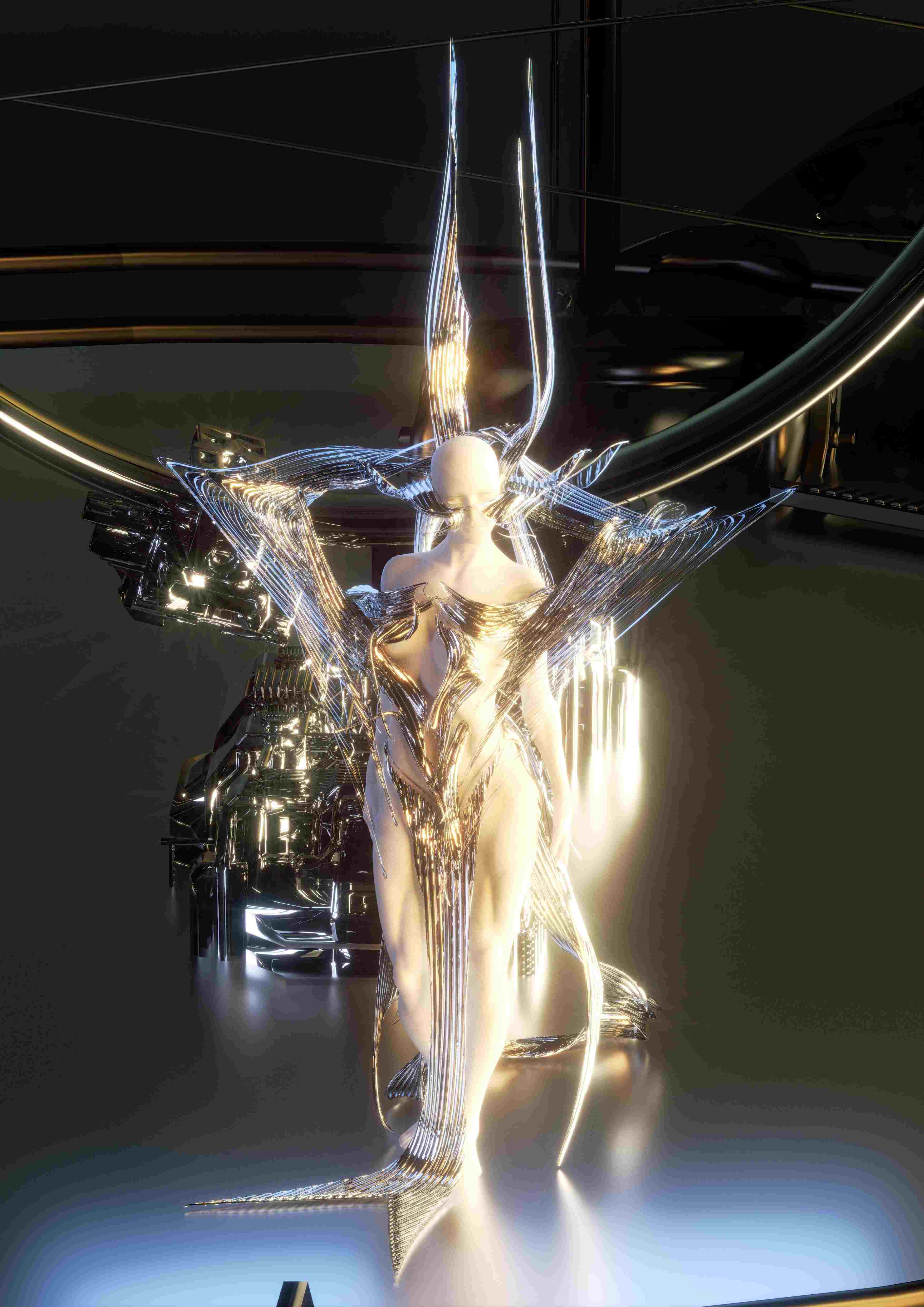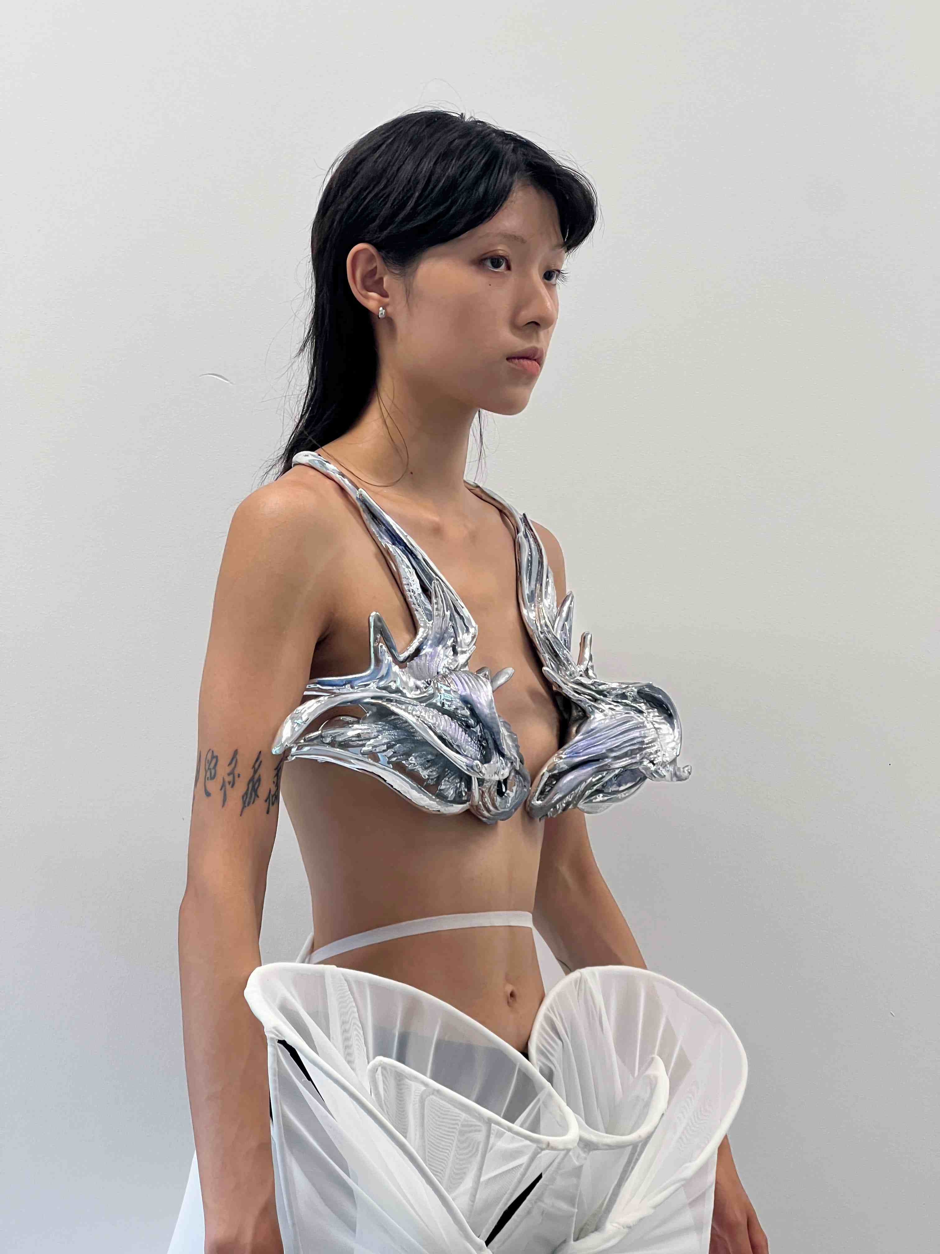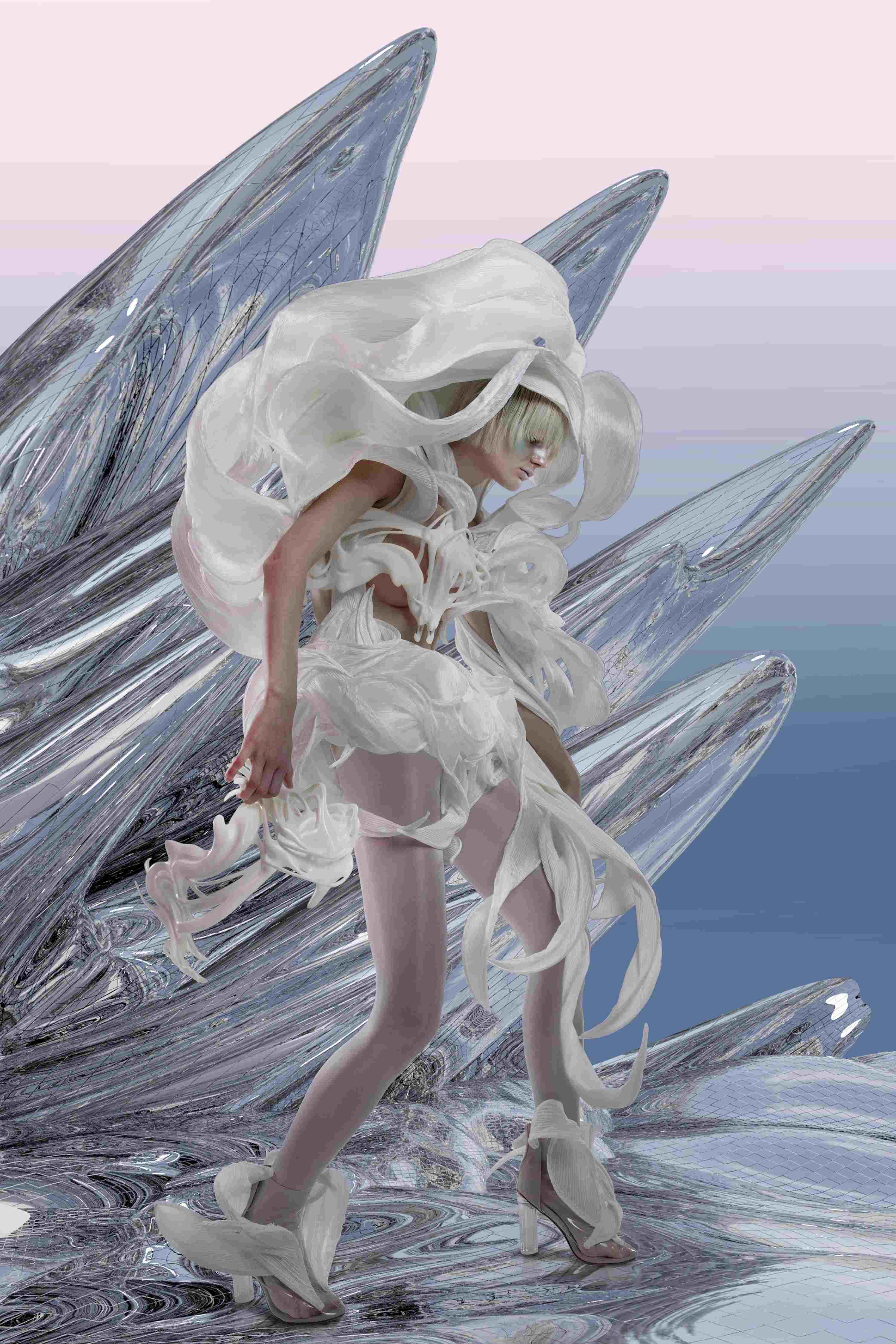 As an influential figure in the field, Fanrui draws inspiration from the enchanting and largely unexplored organic forms found in marine life. By amalgamating these fascinating physical inspirations with the unique characteristics of digital technology, such as algorithms and open methodology, she envisions clothing as a transformative force capable of redefining the notions of body and identity.