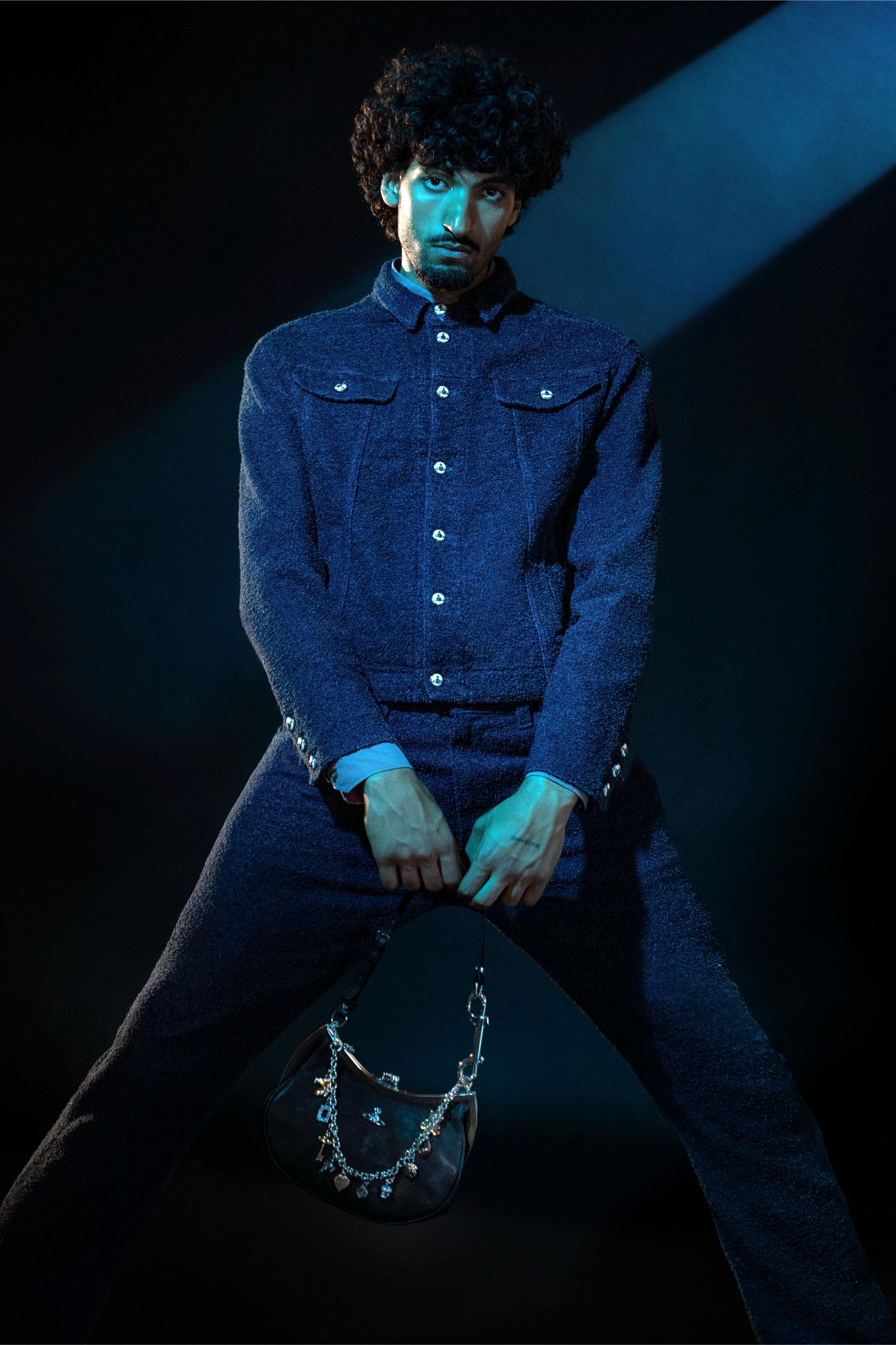 The pieces styled throughout the series, such as the blue bouclé denim jacket and jeans, reveal unexpected textures when captured mid-motion, while the black leather purse with charms introduces contrasting rigidity against the fluidity of the look. Tailoring in blue fil coupé—a jacket paired with matching trousers—responds dramatically to gesture, catching light through its intricate woven detailing. A check-motif shirt and tartan canvas shoes add a graphic counterpoint, grounding the movement studies in Westwood’s unmistakable ethos of pattern, craft, and subversive heritage.