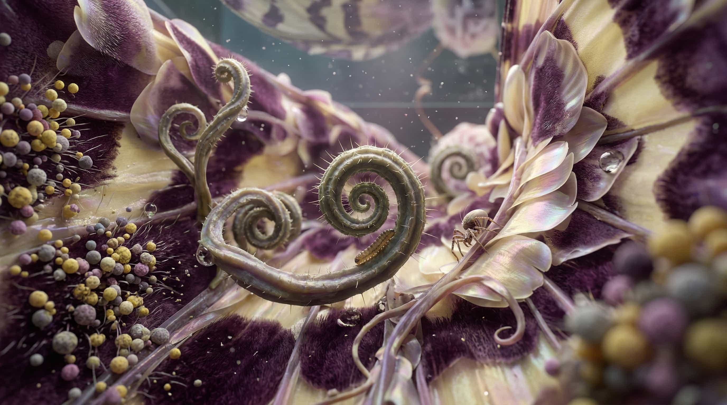 Metamorphosis is central. There is no stable form here. The flower is already something else, the wings do not belong to a defined body, elements continuously merge into one another. I am interested in this intermediate state. It is not only a reflection on transformation in living systems, but a way of imagining forms that have not yet been codified. There is a dimension that approaches the post-human, but without defining it rigidly. It remains an open possibility.