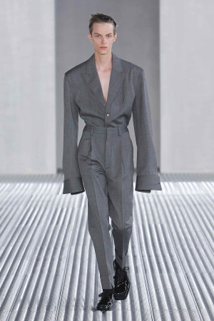 A Departure from Tradition: The shirt, traditionally considered a basic element of attire, takes on a new significance in this collection. Its structure and details serve as the launching point for a transformative journey that touches every facet of menswear - from suits to raincoats, active sportswear to reporter jackets. This reimagined construction invites us to reconsider the very essence of our sartorial choices and to explore the paradox between silhouette and materiality. The collection's simple beginnings ultimately lead us to a profound awareness of the body within and its yearning for liberation.
