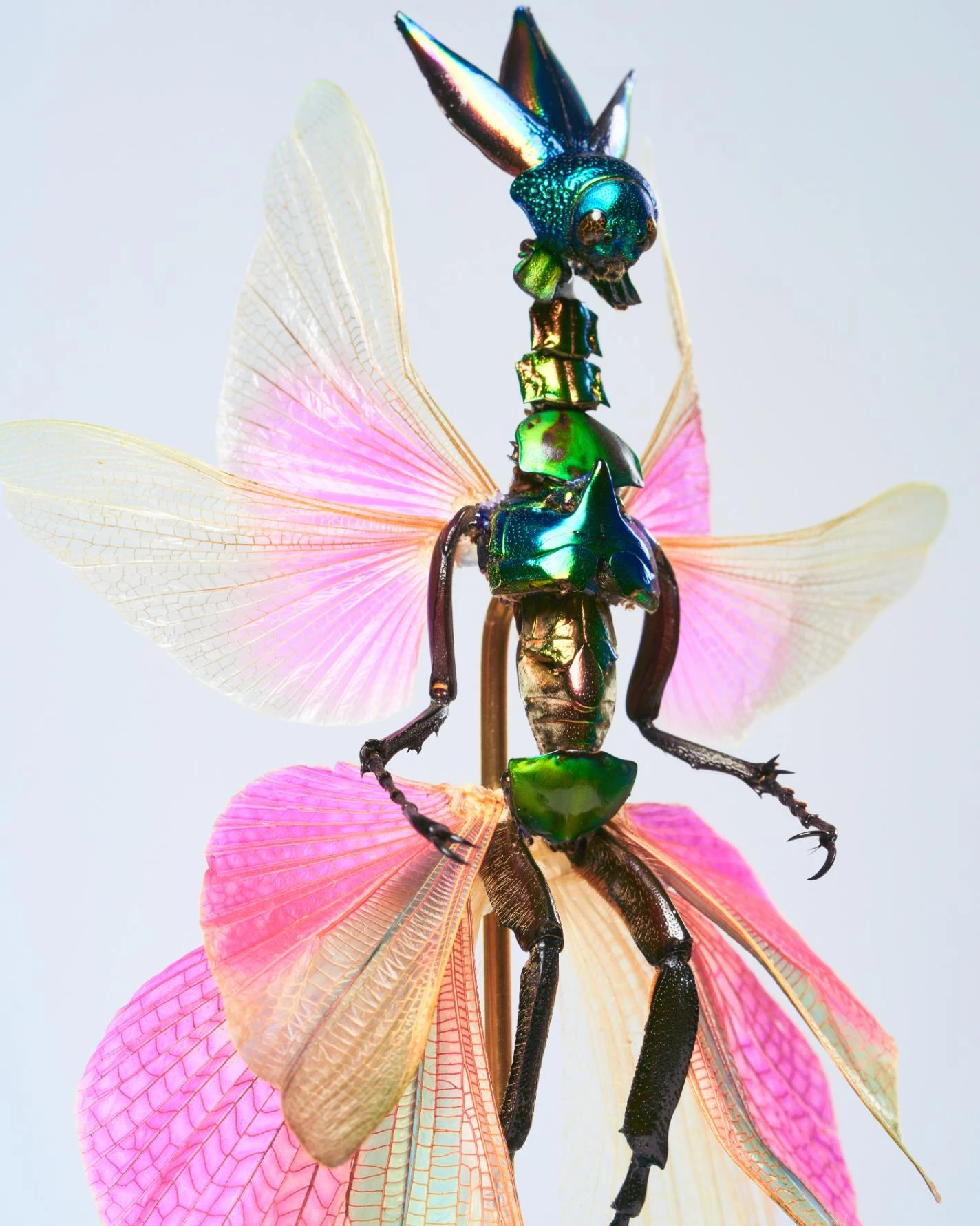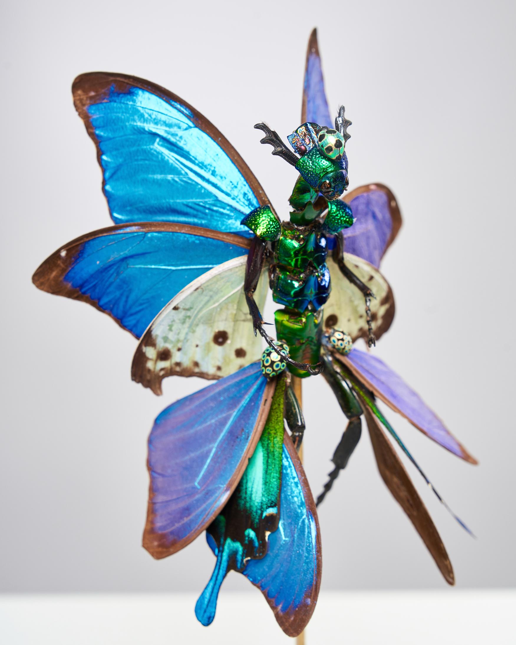 Your creations include fascinating combinations such as fairies made of insects and taxidermy made of flowers. What drives your interest in these unusual pairings, and how do you see them contributing to a dialogue about nature and beauty? Could you share the inspiration behind a specific piece that showcases this approach?