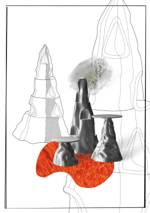 To synthesize this symbolic force, relying on the totemic aspect of the Palaver Tree, I wanted to create a sensitive furniture by its shape, and powerful by its allegoric resource. To meet these two goals, I designed 3 pieces that, all together, describes a landscape, offering an evolutive scenery (the reflection of the surfaces enhances this aspect). In the tallest sculpture, each user can integrate objects that are emotionally linked to them. The carpet, on the ground, by its large and organic format, invites for gathering and share space. The two other elements can be perceived as seating or table. The further this idea got, the further I saw it at the interface of the idea of contemplation conveyed by a Japanese garden and the gathering power of the Palaver Tree.