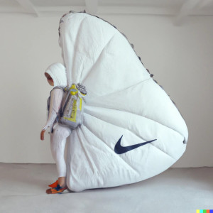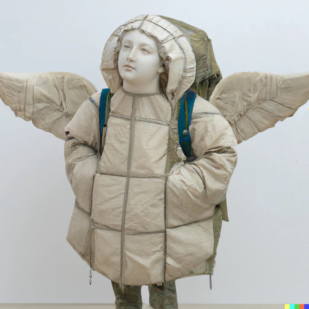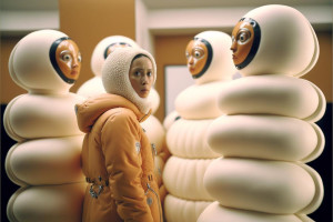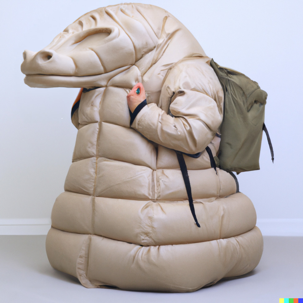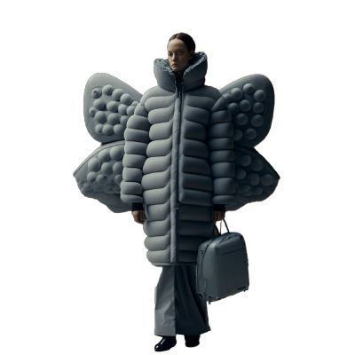 I think the most eye-catching and captivating images are the ones where a person (or weird biomimicry mutant) is occupying the center with an almost theatrical pose. The poses are dictated by biases in the software: If I use certain fashion keywords in the prompt, the AI remembers parts of databases which contain photoshoots with models or magazine covers where people are more likely to strike a certain pose. I am currently exploring the puffy clothes trend and realistic lighting that highlights the creases and folds of these fabrics. The puffer jackets and outdoor clothes in a non-outdoor environment combined with certain animalistic features gives it an interesting juxtaposition.