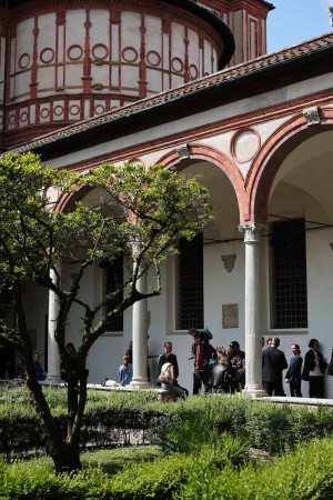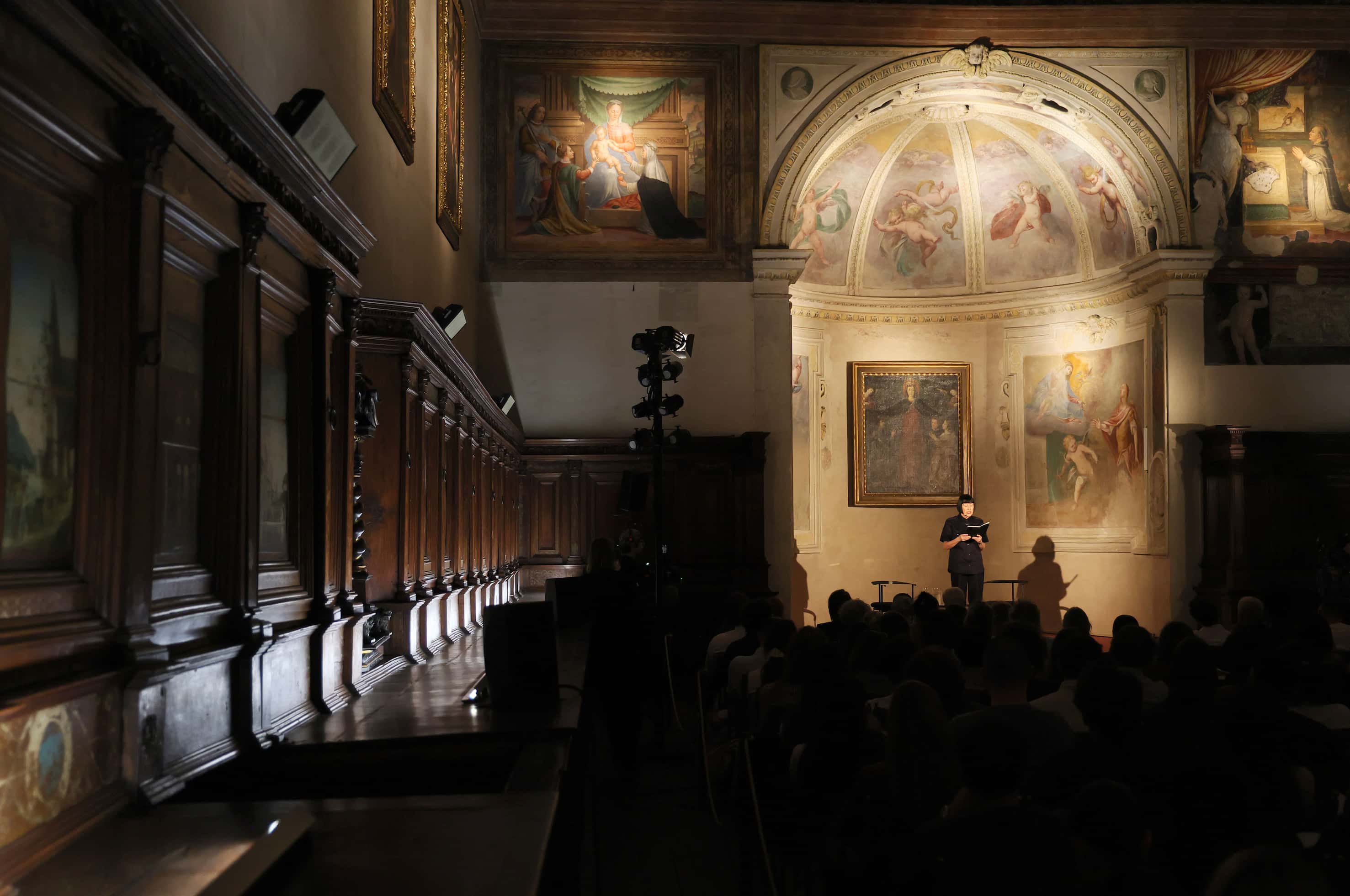 Beneath the Renaissance vaults of the Sacrestia of Santa Maria delle Grazie, traditionally attributed to Donato Bramante and lined with intarsia panels depicting biblical scenes, the space gathers bodies into a suspended field of attention.