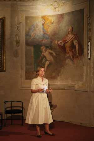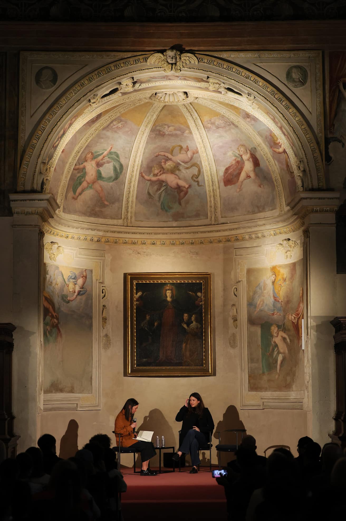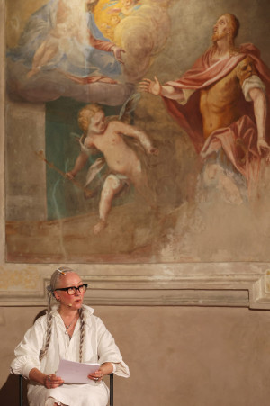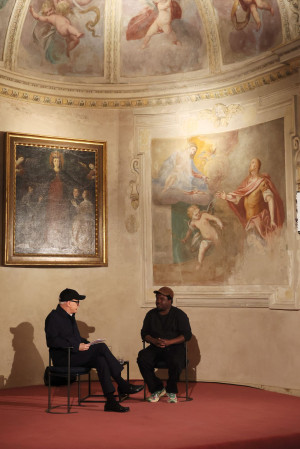And then there was Mark Leckey. Moving between the liminal spaces of the late Middle Ages and the Renaissance, Leckey delivered an inspiring semiotic reading of Paolo Uccello's The Battle of San Romano, a painting of chaotic combat, lances crossing, horses rearing, figures entangled in a field of visual noise. His provocation was simple and unexpected: those times, he suggested, resemble our times. The fifteenth century, with its collapsing certainties and its technological upheavals such as the linear perspective, was not so different from the present. Leckey's reading transformed the sacristy into a time machine.