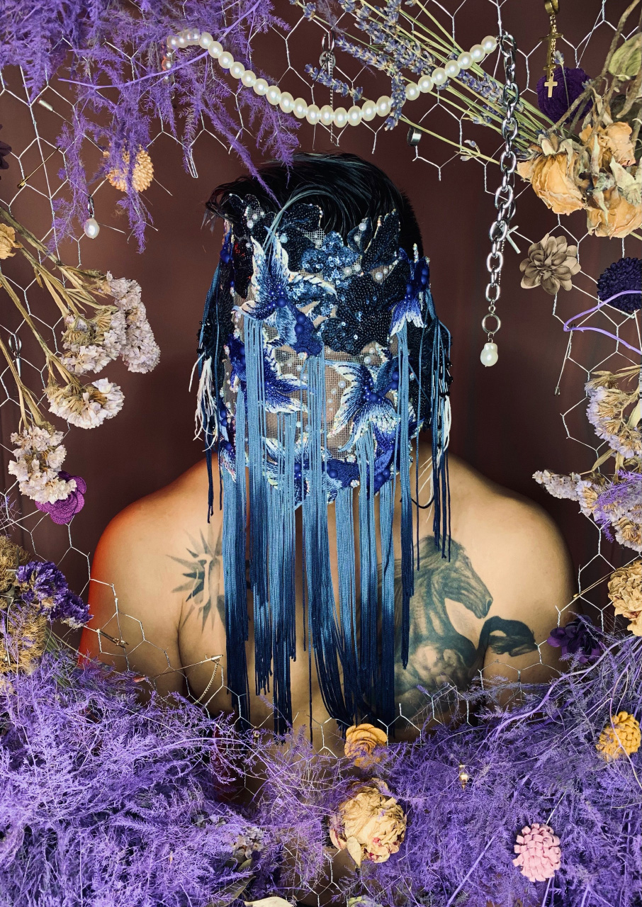I touched a little bit on that in an earlier question, but it stems from building a universe where all my creatures or “tres bizarre” masks inhabit. Each mask has a backstory and some pieces evolve with each life experience it experiences. For example, Neon Ninja 2.0 mask came from an editorial beauty shoot using silicon fish bait and faux leather face pieces. It morphed into a mask where it grew neon tassels and gold barnacles on the beadwork. It is important to me that my masks live and transform over time as would any creature alive. The first iteration of the mask, when created, can transform according to when it is being used in a photoshoot , a fashion runway, a dance number or exhibited in a gallery. When a collector purchases a mask of mine that is not privately commissioned, they are aware of the history of each piece, the journey it has taken and its final evolution until it belongs to them.