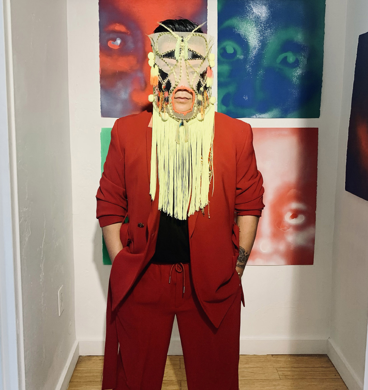 My first brush with Art was in another form, the Performing Arts. Being trained in a Performing Arts college was my gateway into learning about the power of storytelling and the distinct ways to conceptualize a universe while taking everyone on a journey using an assortment of tools at my disposal such as words and visuals. Another aspect was learning character studies when we broke down a scene. What made a person the way they are, are there underlying nuances beneath the surface? How does the character move and notably why does the person wear what they do to convey who they are? I think about what character each of my masks are and how to deliver it through the design and movement. What am I conveying with each art work and am I placing messages forthrightly or are they hidden in the creation? Part of my process involves photographing and filming through different stages of construction as one would when you fit a garment on clothes and in likeness to a director putting a performance piece together.