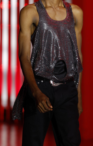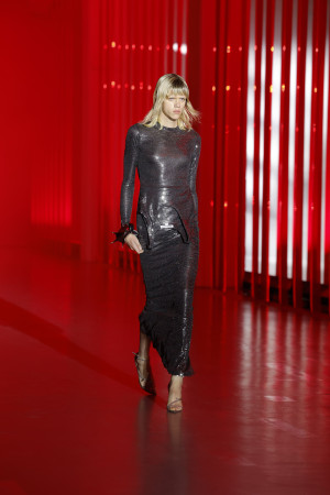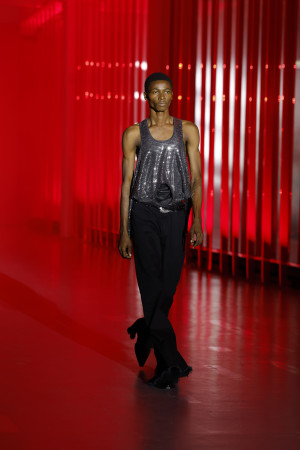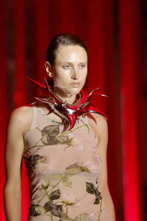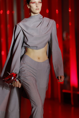 Within the collection, there is an underlying pursuit of intense and passionate connections. Whether fleeting or enduring, tender or cannibalistic, this search for supercharged sexual energy permeates many of the garments. One notable example is the draped top with its delicate wisp of chiffon, evoking a sense of vulnerability and sensuality.