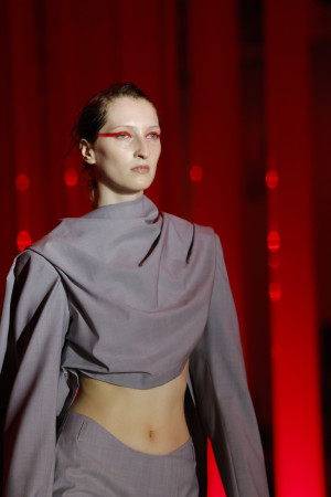 Building upon the distinctive "bulldog" style introduced in FW23, the collection introduces new interpretations of trenches, single and double-breasted blazers. Kilting, a traditional Scottish style, is reimagined in the form of kilt-pencil skirts, dropped blazers, draped kilt/dresses, and jackets. These designs are meant for a society transitioning into a post-anxiety period, where individuals derive joy from adversity and find happiness amidst a challenging economic outlook.