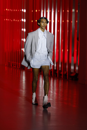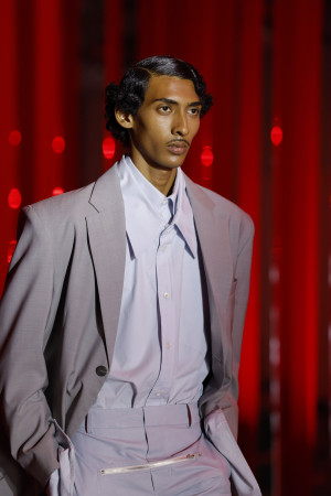 Draping takes center stage in JORDANLUCA SS24, emphasizing high-necked austerity, lace, ruching, and gathering. Both menswear and womenswear feature suiting that carries connotations of The City and Wall Street. These designs are not mere reflections of the past or projections into the future; they are creations for the present moment. With an extreme and binary understanding of men's and women's bodies, JORDANLUCA challenges gender norms while still honoring traditional silhouettes.