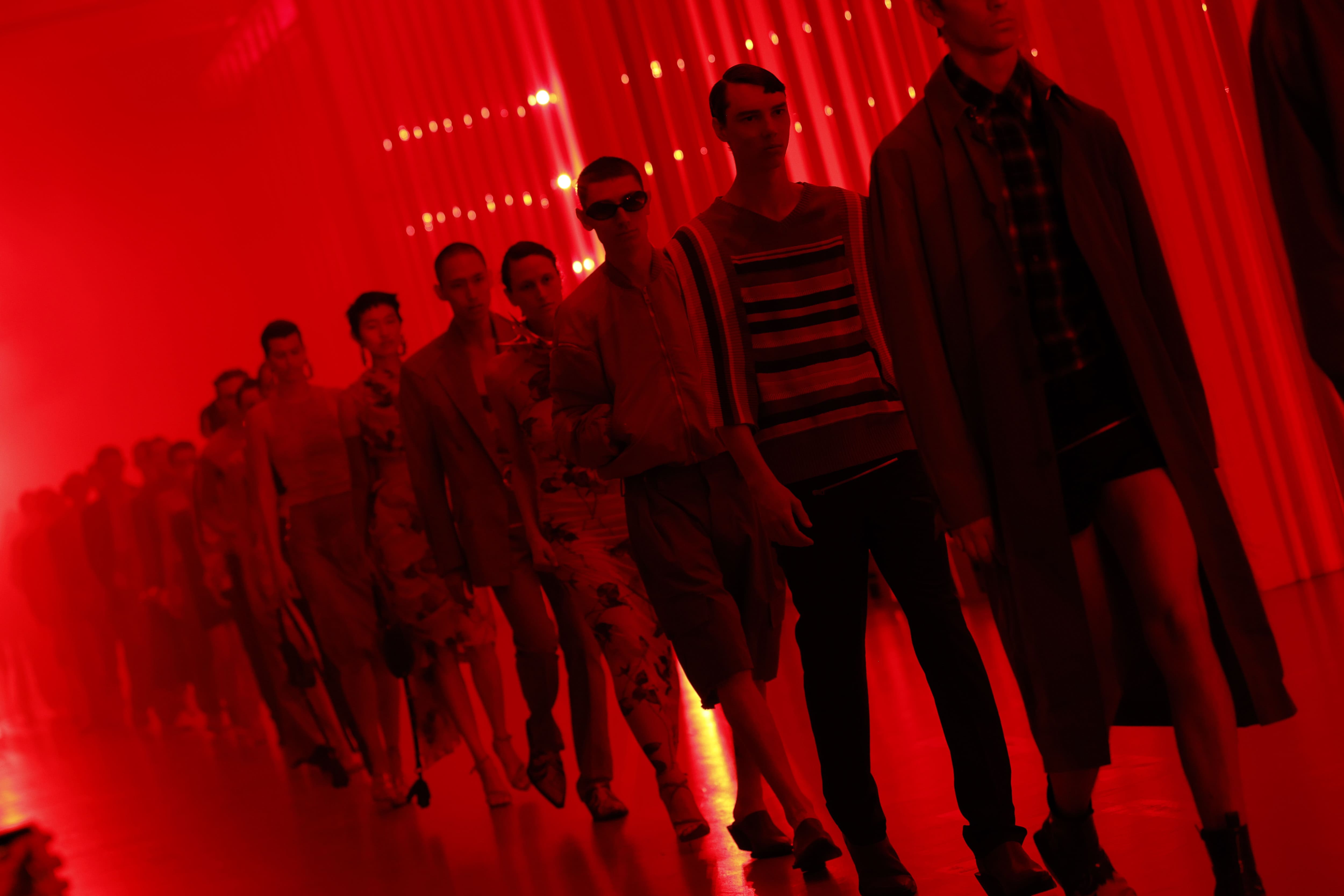 Contrasting against a backdrop of various greys, browns, neutrals, and muds, the fleeting presence of red within the garments creates an intriguing tension. Glamour, crisis, and the philosophy of absurdism converge, offering a nuanced perspective on the current human experience.