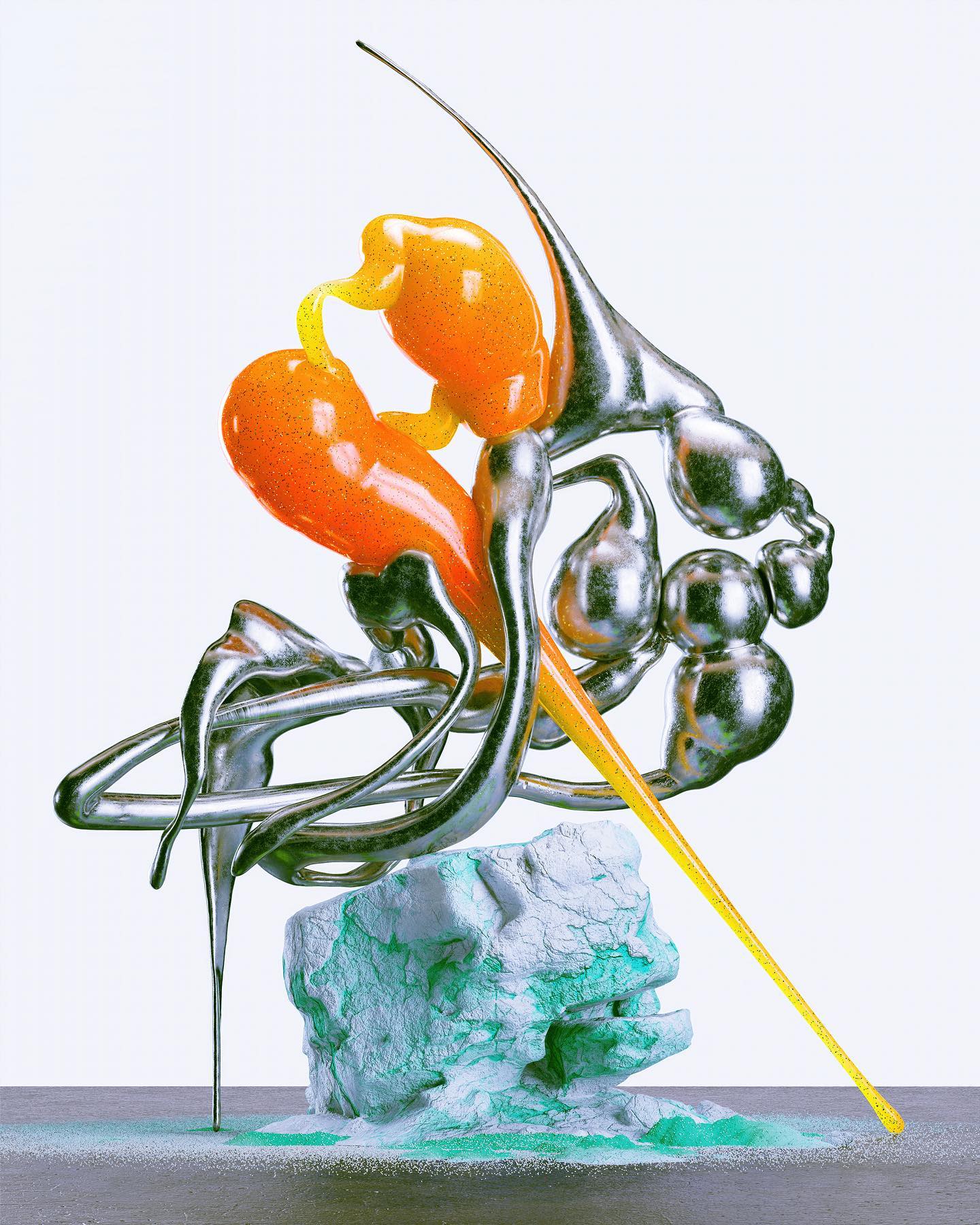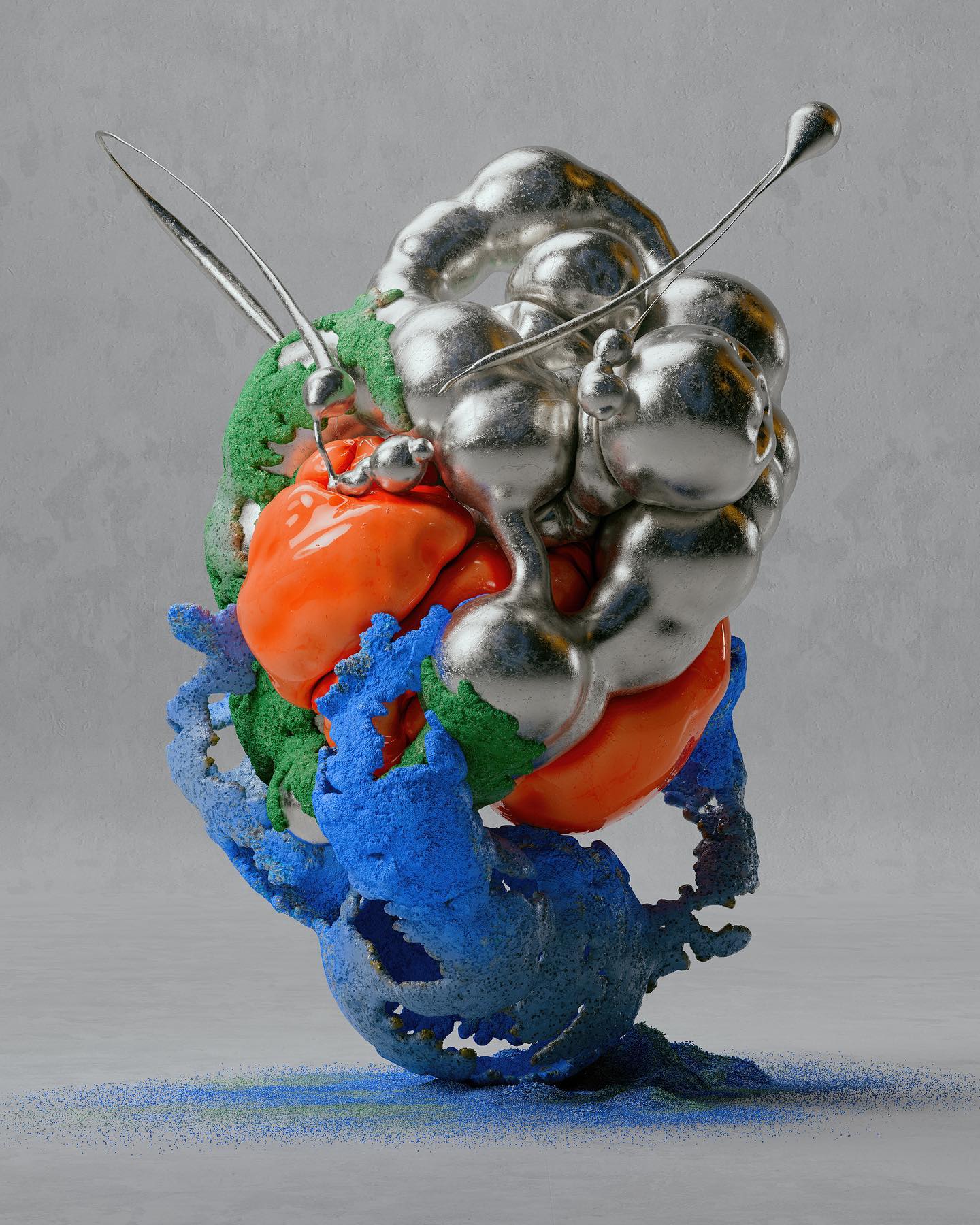 My inspiration comes from artists across different disciplines, including the visual universeof musicians likeARCA, Björk, Aphex Twin, and other figures in alternative music genres. The research of Neri Oxman andLucy McRae fascinates me, and I'm intrigued by their vision of the future. Additionally, the work of JonathanCastro and the experimentation with light and color by Olafur Eliasson and Carlos Cruz-Diez have all subtlyinfluenced my creations.Being part of the Hyperfuturism collective, I'm surrounded by artists with unique styles who envision thefuture of digital art authentically and personally, which has also been a significant influence.In my designs, I always strive to balance minimalism and chaos. I maintain the correct weight in composition,allowing the sculpture to breathe in a minimalist and clean space, which visually adds a poetic touch. Thecomplexity of the forms, combined with fractured details, is balanced with the harmony of color andcomposition. Even in seemingly monochromatic works, color is an essential element, where I use metal as atexture, and slight color detailsin reflections come to life.