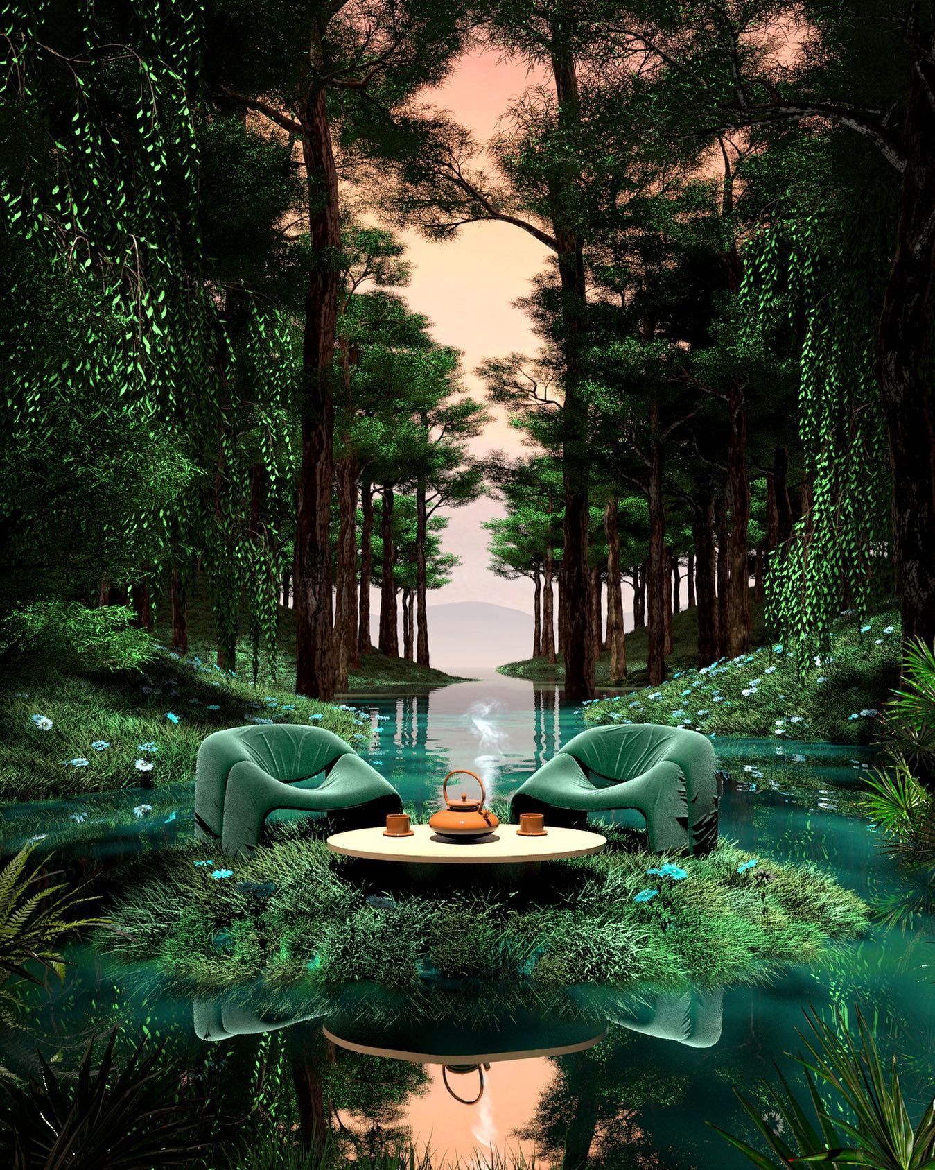 Joe Mortell creates dreamy designs, where the organic and inorganic marry in beautiful harmony. Details rule supreme— shadows to show natural lighting, curated hardcover books, and greenery in motion. You just want to step into this world of balance and peace, but that’s the catch, they are 3D. Mortell creates surreal spaces that reimagine how we live and inhabit space, and are influencing the physical world with his “The Shirinda Residence” design being transformed into a physical space.