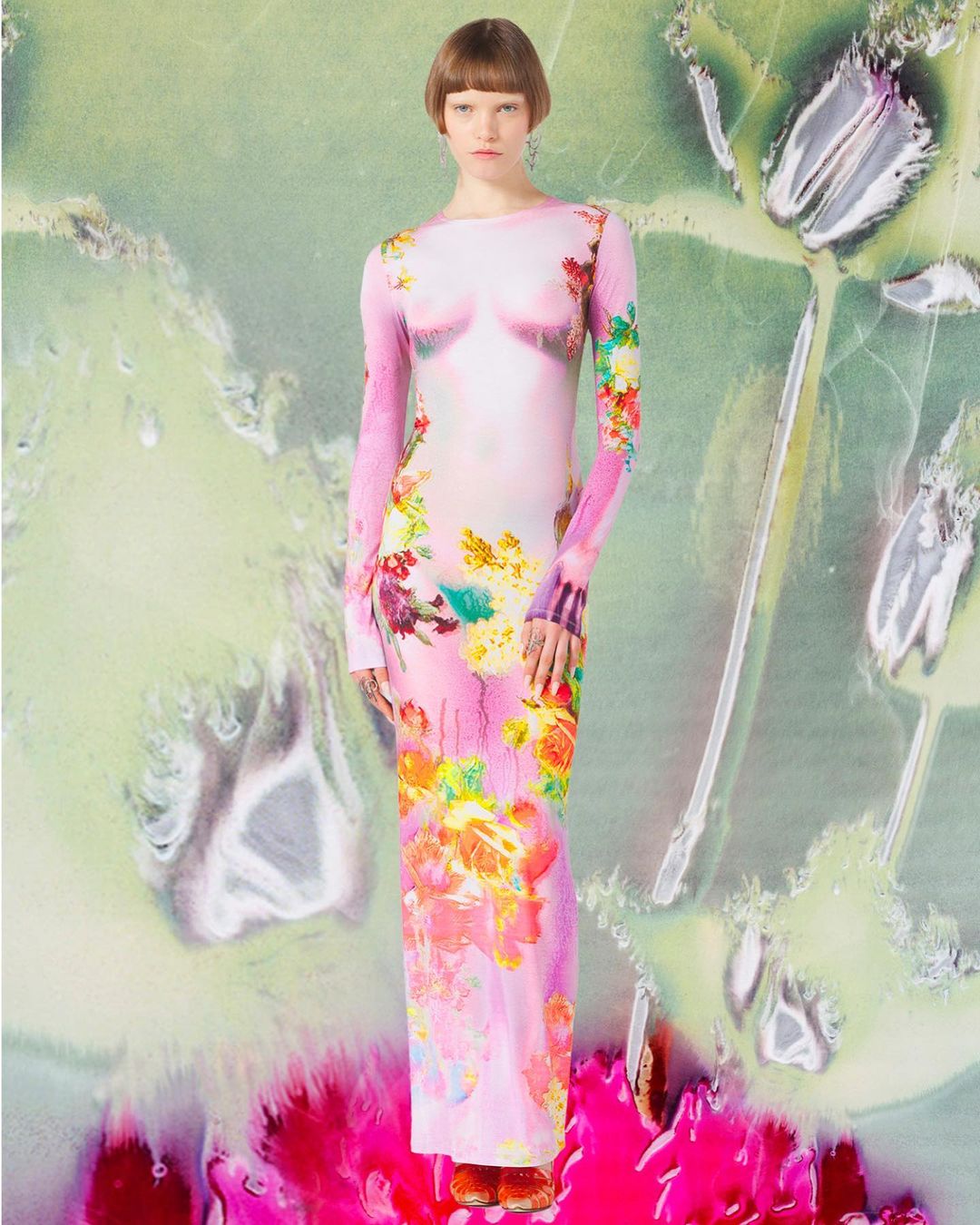 With their hallucinatory colors, liquid shapes and shifting contours, subjects keep evolving into something else: naked bodies resemble cyborgs or dolls with their supernatural shine and hues, while industrial machines are reduced to abstraction.