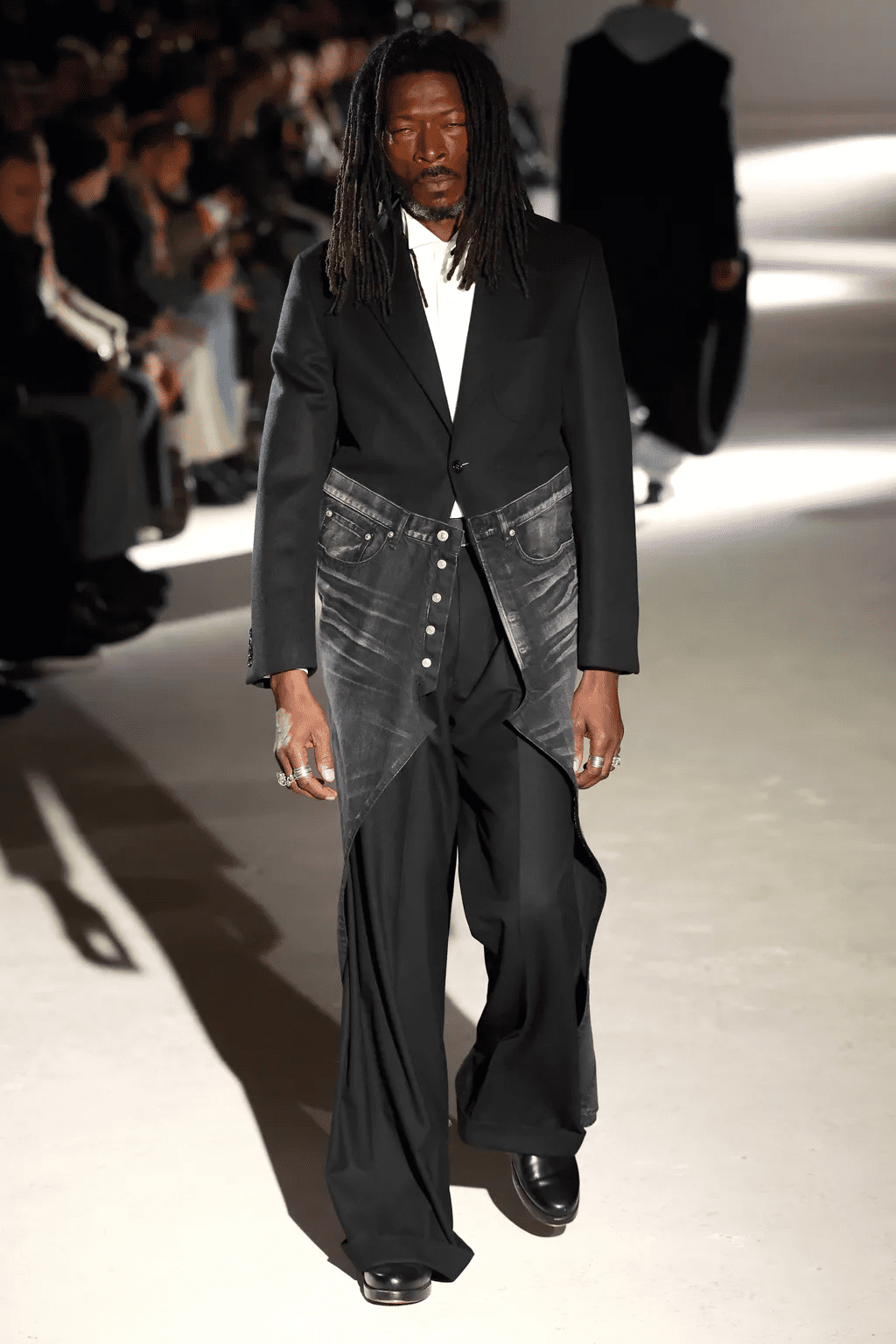 Rick Owens, on the other side, decided this time to pay his respects to his motherland, America, by following a more relaxed but unsafe pathway. The princes of darkness, as many people like to call him, took us inside his Parisian palace, which calls home, for a ride to Porterville, the city in which he was born and raised. With this powerful but not quite original move, the designer epitomized contemporary dressing, drawing a line between high fashion and the masses. Within his most personal and safe space, his home, Rich Owens told loudly a story of alternative beauty, sensuality and intimacy by giving a roof to a collective of people to create and express themselves. Like Straytukay, who did the inflated rubber boots; Leo Prothman who made the Kiss boots and Matisse Di Maggio who focused on the rubber pieces. A new community was born as a genuine gesture of serf-reinvention.