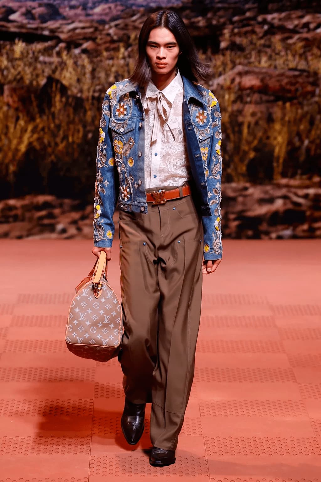 Louis Vuitton opened Paris Fashion Week with its extravagant cowboys. Pharrell Williams envisioned the contemporary Native American man in all his glory - bathed in gold and dressed in crocodile skin, to be exact. It sounds a bit barbaric, right? It’s how it felt, too. Lace shirts were embroidered with lasso-throwing cowboys and denim jackets with yellow desert flowers. Chaps in leather or denim were embroidered in saddlery patterns or fringed, and a sea of LV logos covered the runway entirely. Serving wealth in the American West (yeah, I know it sounds like a movie), it’s definitely not going to win any Oscars this years, although I have a feeling that it will be quite popular with the masses.