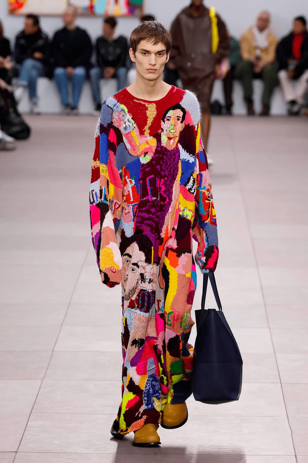 Exactly how Jonathan Anderson imagined the contemporary man for his Loewe collection - in one solid piece. Almost like God, Mr Anderson molded the modern man in a glorious way. During a very dark and monochromatic fashion week, the designer gave us an explosion of color. A green leather jacket with a large pussybow popped on the runway as an opening look, and quickly a rainbow flooded the stage, which was decorated with Richard Hawkins’s artworks. The collection bared the creative director’s twisted essence of fashion. Having clown sneaker sock-boots or pieces that were attached to another, the show gave another meaning to what multilayered stands for in fashion, putting the bar on new heights.