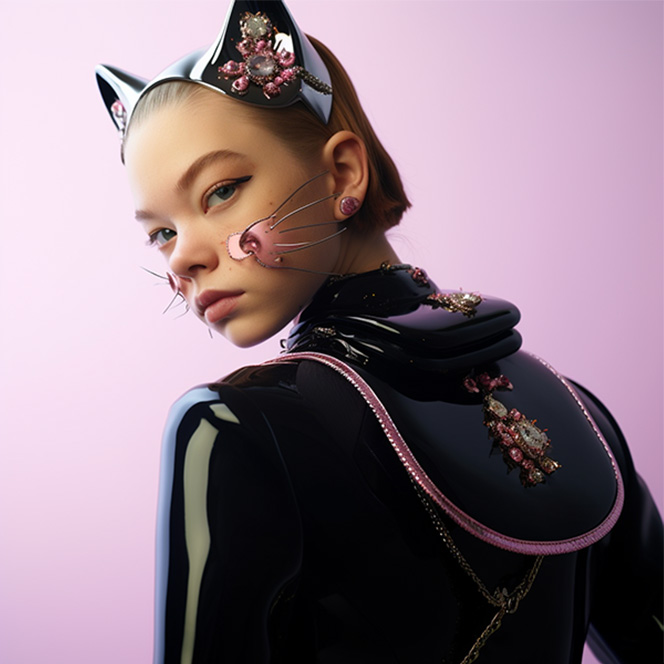 At RED-EYE, we are committed to shaping the future of fashion. Our groundbreaking and engaging feature, PortrAIts & Still lAIfe, is dedicated to highlighting emerging and fascinating talents in the fields of fashion, art, music, and design. Featuring a wide array of individuals, including models, designers, stylists, and industry professionals, this project celebrates the diverse spectrum of personalities in the fashion industry. What truly distinguishes this endeavor is our intricate co-creation process with artificial intelligence, enhanced by a personal touch.