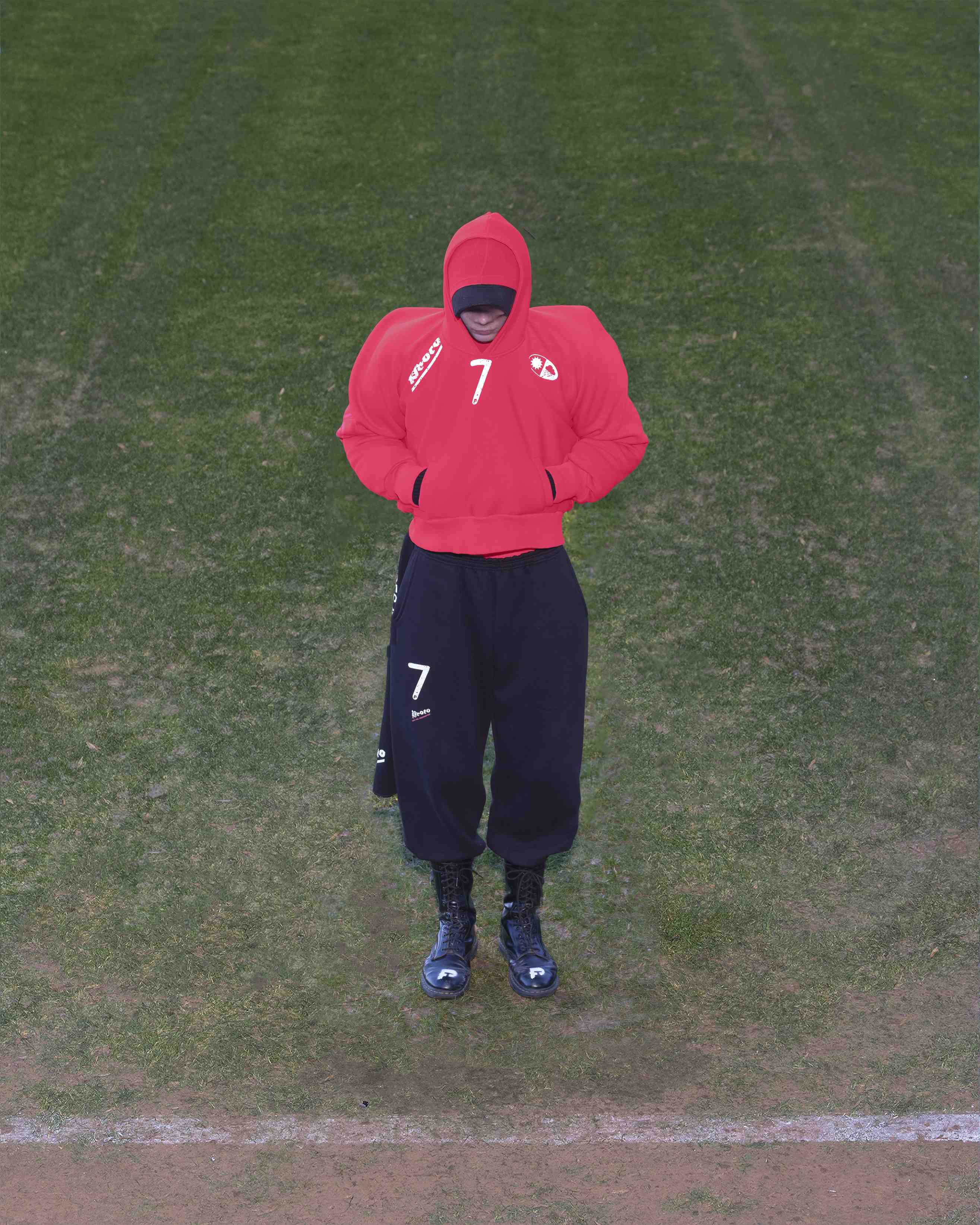 Aligned with the brand's ideological framework, Series06 is meticulously constructed from upcycled sportswear, including tracksuits and old football shirts. Sportswear, typically discarded after each season in the commercial realm, is repurposed by Prototypes into a new kind of uniform. This sustainable approach not only aligns with the brand's commitment to environmental responsibility but also reflects a thoughtful commentary on the cyclical nature of fashion itself.