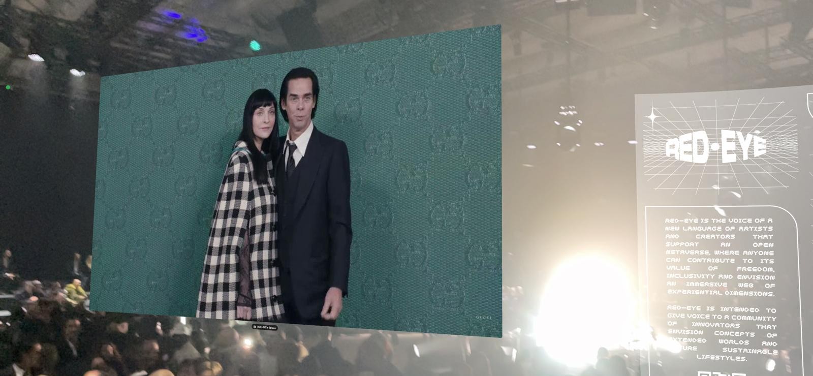 Susie Cave and Nick Cave in augmented reality as they attend the Gucci show FW23 during Milan Fashion Week
