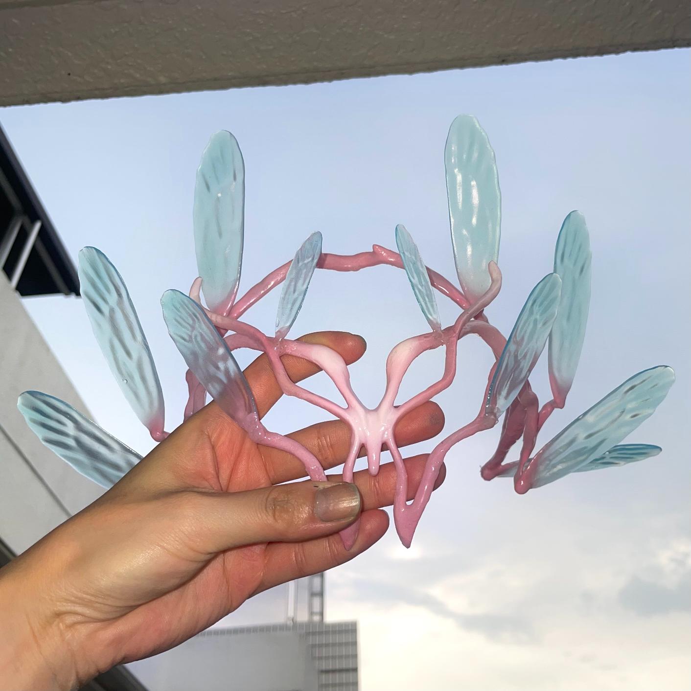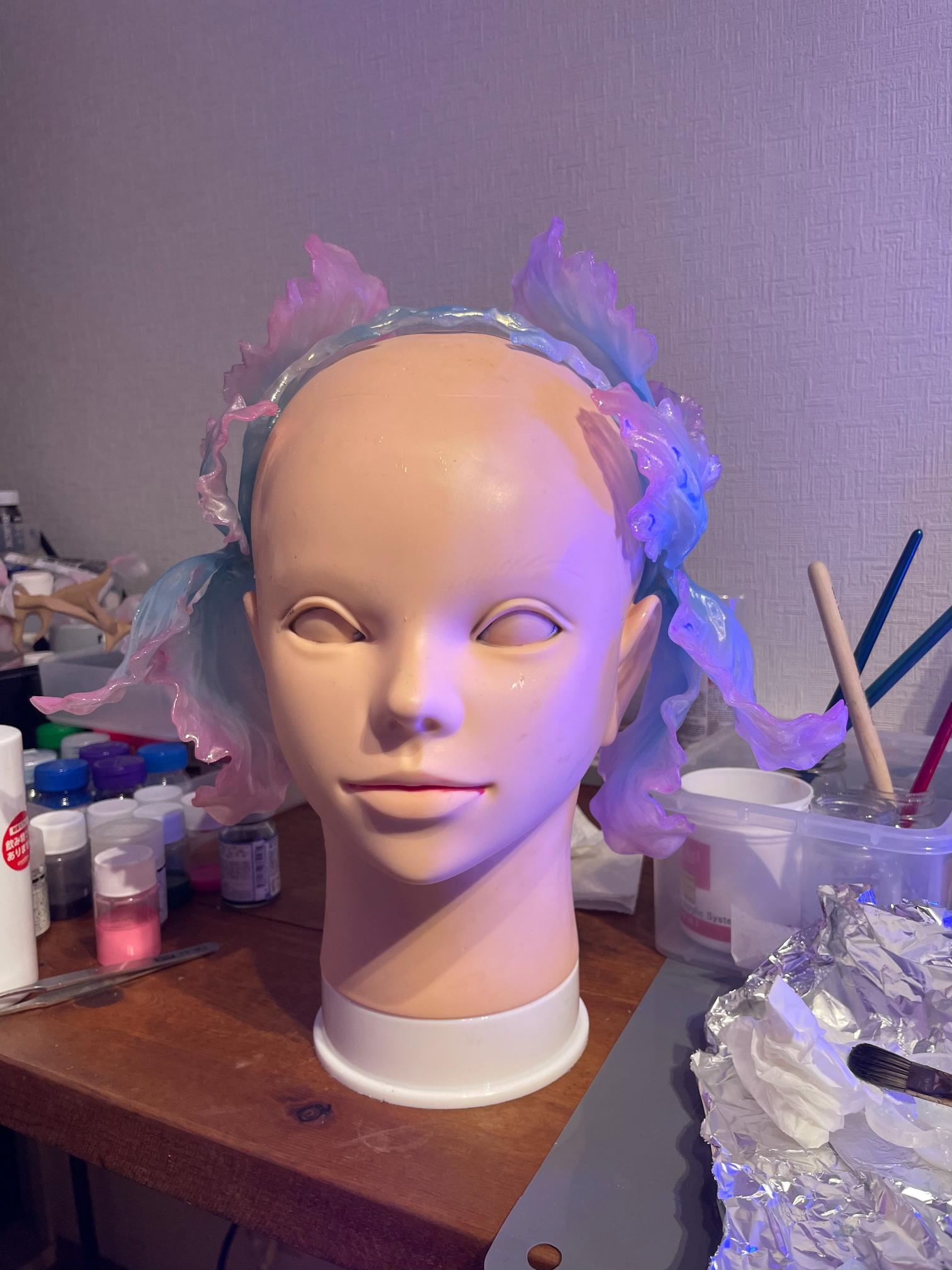 I believe that my career as a hair + make-up artist has helped me develop a sense of physical fit, design from a fashion point of view, and color and three-dimensional balance. The production process involves creating the design on a blender, outputting it with two 3D printers (SLA and FDM), and finishing it off with a final airbrush.