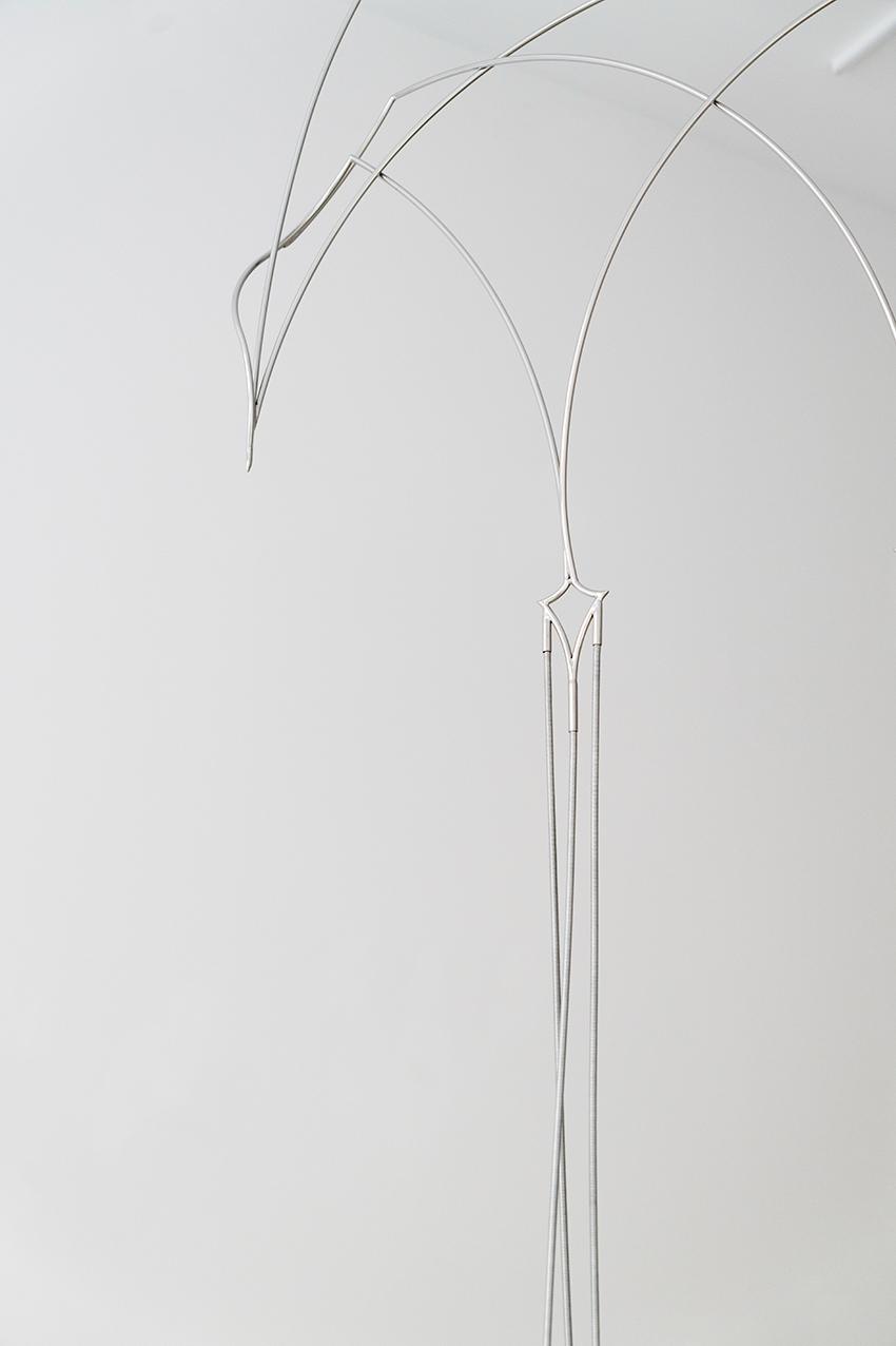 In “Speak to me in a floating way” the works on paper are full of floating shapes and figures that mix between the full and empty spaces, the steel sculptures are inspired in their shapes by pointed arches but become similar to kites or jellyfish floating in space. For the occasion I thought of the installation as an extension of the works themselves. Everything was floating, in a place that recalled a sacred but alien dimension, like entering a church but at the same time an operating room. Even in that case the will was to reach a dialogue between opposite dimensions that did not cancel each other out but fed each other.