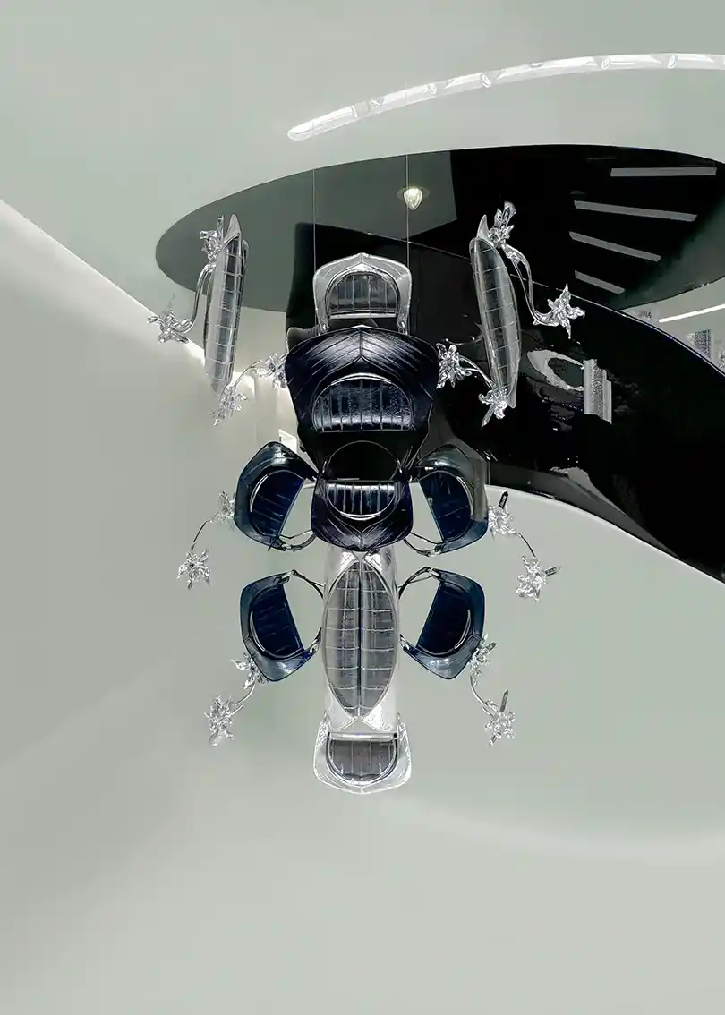 On that occasion Daniel had created a new collection of accessories, bags specifically. The idea was for me to compare myself with these creations. They had very interesting, alien shapes, they almost seemed like pieces of exoskeletons. At that point I immediately thought of using his creations directly to transform them into something else that at the same time concerned them, bringing them back to what he had perhaps been inspired by to create them. I designed steel skeletons that could act as a seat to be able to set his creations and arrange them in a certain position. So as to transform them into insect sculptures.