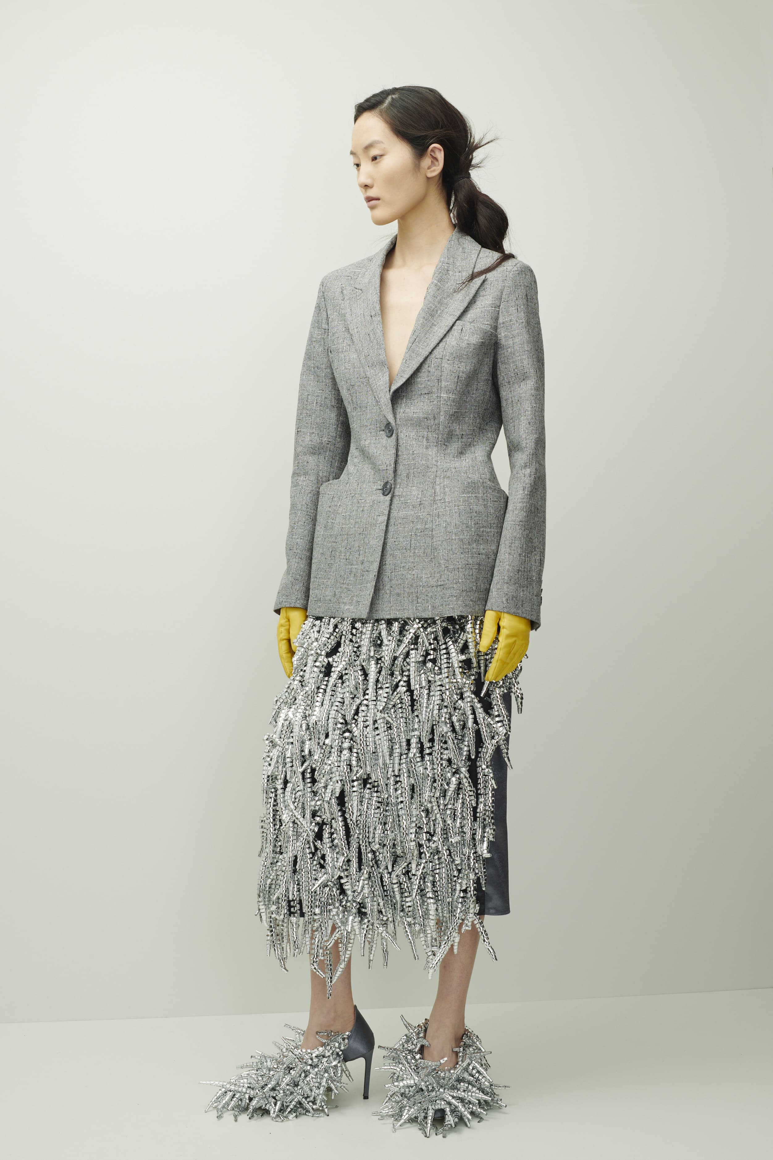 The process of making some garments is long and artisanal, requiring up to 72 hours of work for every detail. For example, the silver skirt takes inspiration from the beauty of curly hair. In his search for the perfect colors, he introduced "Hibiscus Pink," which envelops the collection in set design, a warm and enveloping shade that invites fantasy. This color, along with others like "Margarita Green" and "Bleached Apricot," is part of a collection inspired by Marcel Rochas' archive, found in Paris at Rue de l'Université.