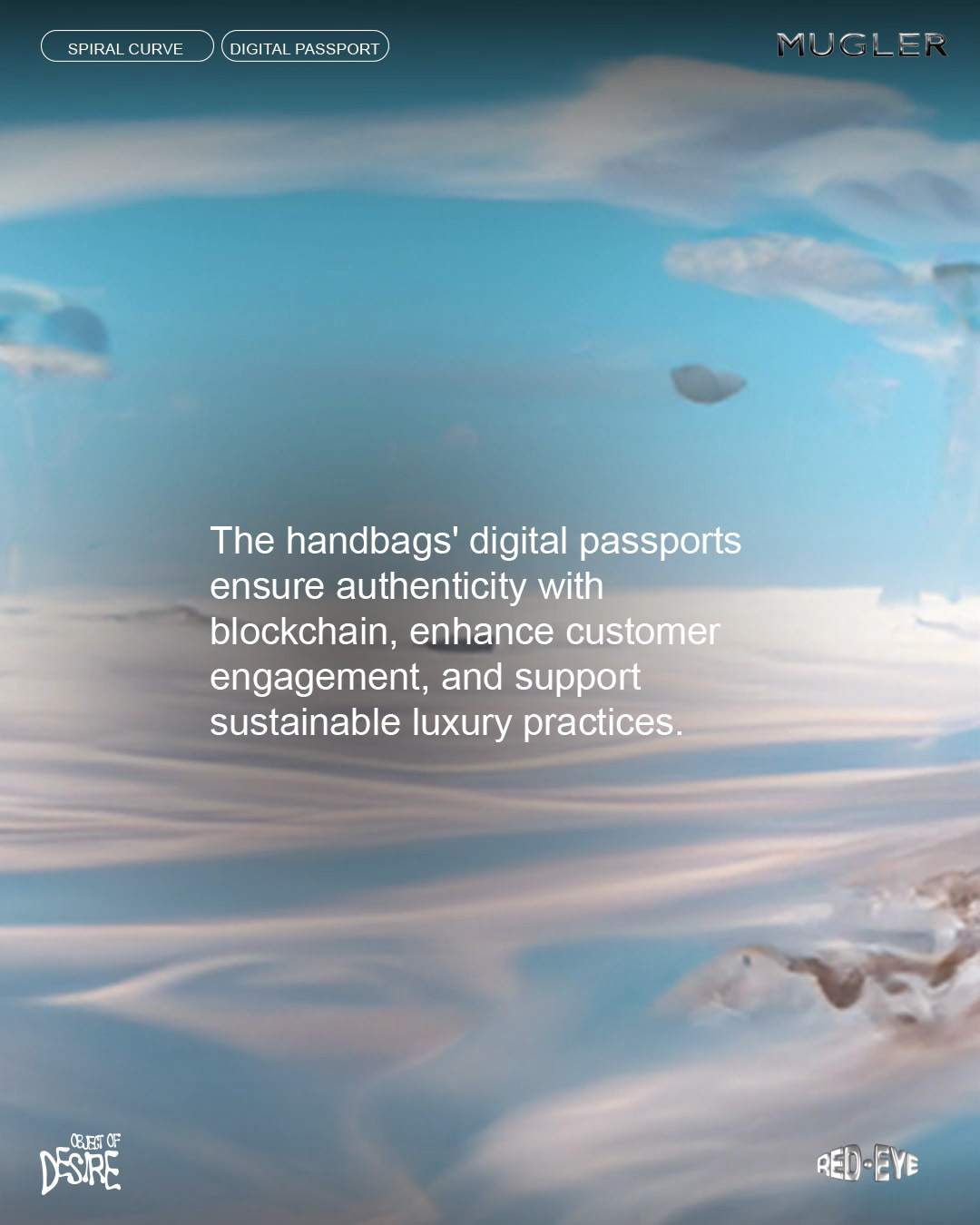 The Spiral Curve 01 and 02 series handbags, available at fashion.mugler.com and selected boutiques, transcend the realm of mere fashion accessories. They become interactive digital platforms, gateways to a host of privileges such as product verification, exclusive material, previews, special invites, and more. Customers can activate their digital passport by scanning a QR code inside the bag and using a two-factor authentication code provided within a protected area of the bag. Each Mugler handbag comes with a unique, blockchain-backed digital passport that not only guarantees the authenticity of the item but also unlocks a world of exclusive benefits.